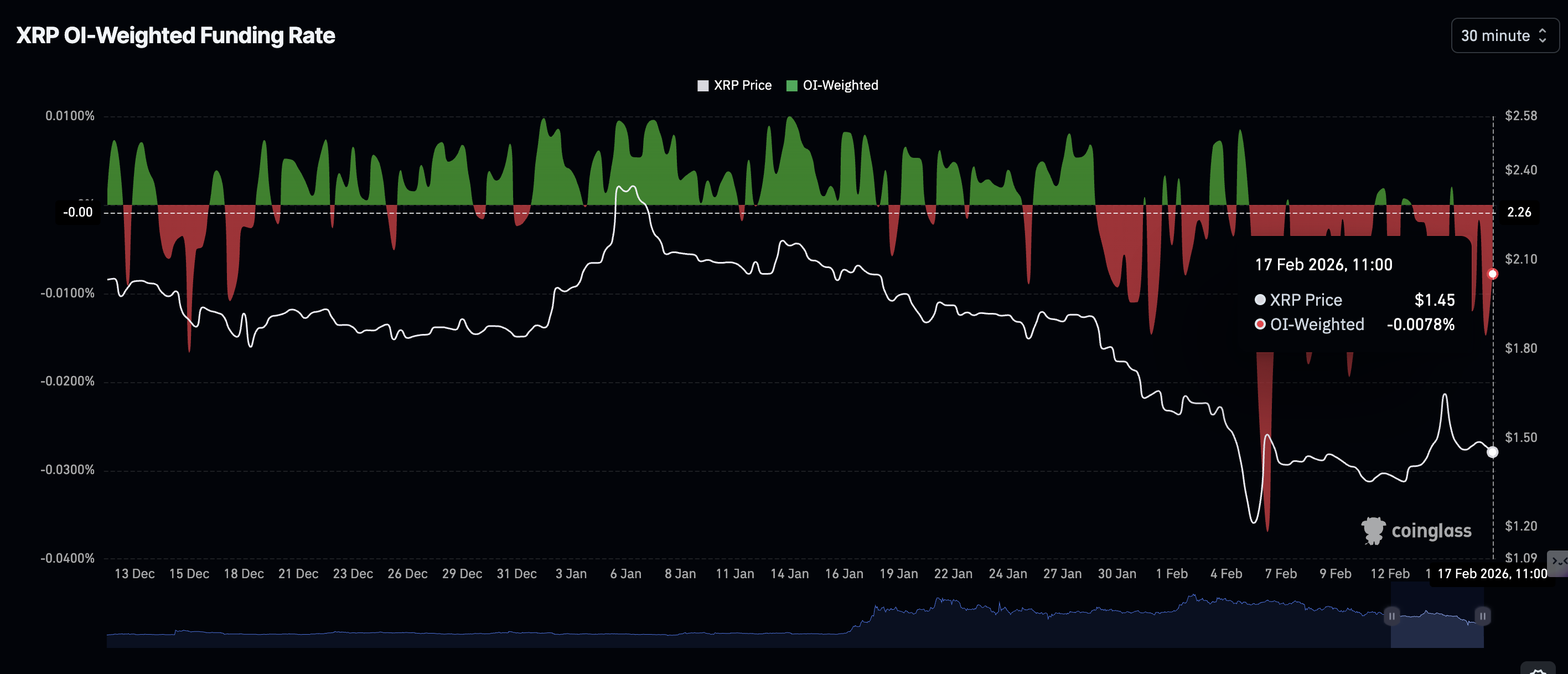 Los datos de CoinGlass muestran que los operadores están acumulando cada vez más posiciones cortas, lo que sugiere una falta de convicción en la perspectiva alcista a corto plazo de $XRP. La Tasa de Financiamiento Ponderada por OI se mantiene en -0.0078% el martes, permaneciendo en la región negativa desde el domingo. Sin un impulso de seguimiento, las fluctuaciones de precios persistirán en medio de una tendencia general bajista.
