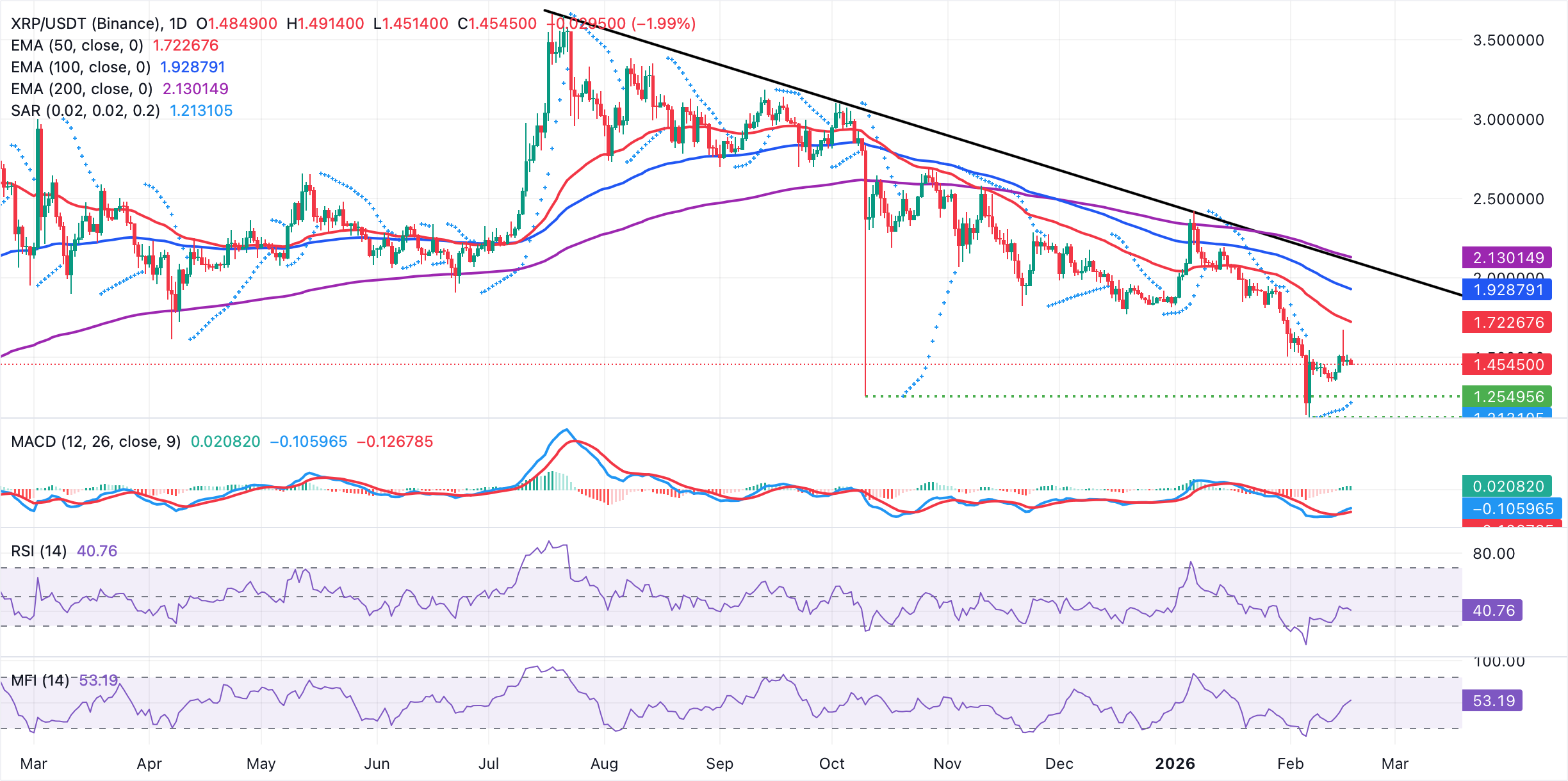 $XRP se mantiene por encima de 1.45$ mientras se sitúa muy por debajo de la media móvil exponencial (EMA) de 50 días en 1.72$, la EMA de 100 días en 1.93$ y la EMA de 200 días en 2.13$. Las tres medias móviles están descendiendo, confirmando una estructura técnica deteriorada y aumentando las probabilidades de prolongar la corrección en curso.