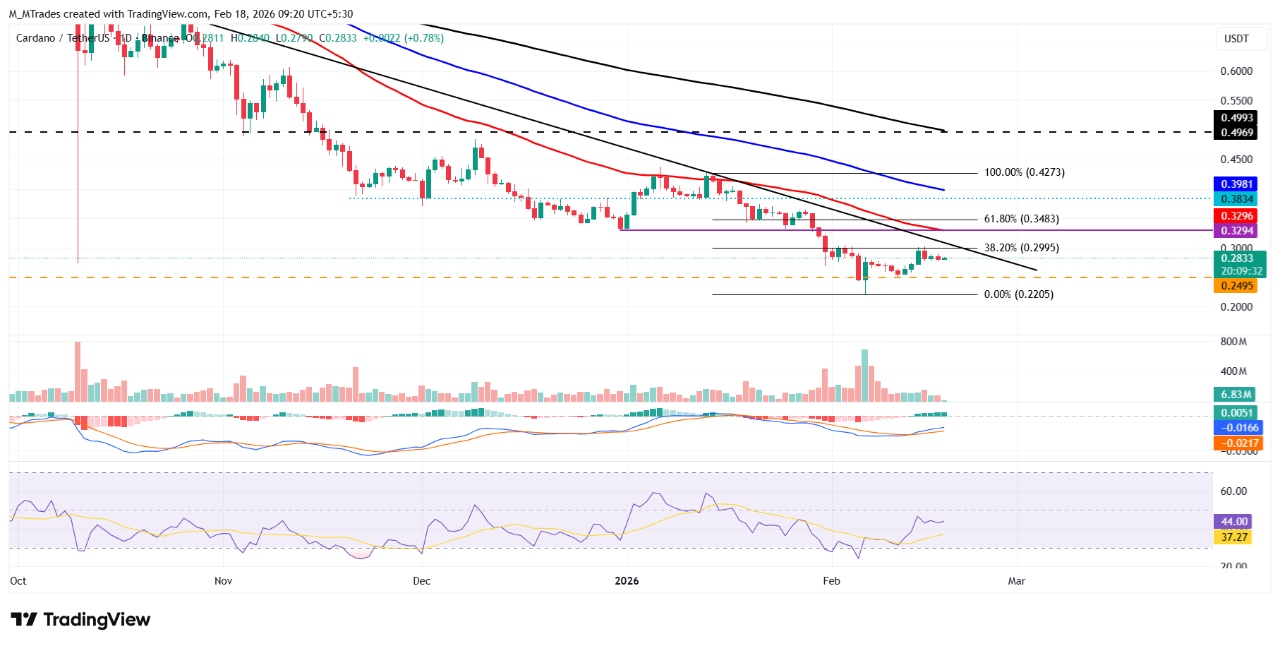 El precio de Cardano fue rechazado en el nivel de retroceso de Fibonacci del 38.2% en 0.29 $ (dibujado desde el máximo del 14 de enero de 0.42 $ hasta el mínimo del 6 de febrero de 0.22 $) el domingo, y cayó un 4.47% ese día. $ADA ha estado rondando el nivel de 0.28 $ durante los últimos dos días y, a partir del miércoles, permanece allí.
