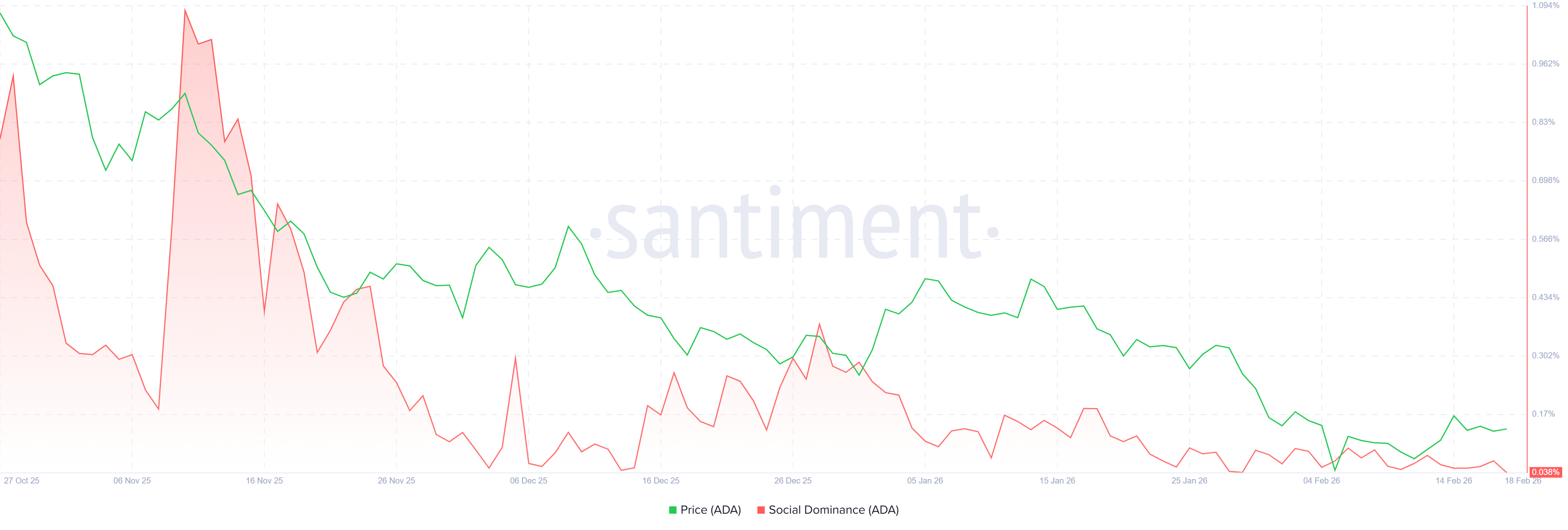 La métrica de Dominancia Social de Santiment para Cardano apoya una perspectiva bajista. El índice mide la participación de las discusiones relacionadas con $ADA en los medios de criptomonedas. Ha estado en una tendencia a la baja desde finales de diciembre, cayendo nuevamente a principios de febrero a 0.038% el miércoles. Esta caída indica un interés de mercado decreciente y un debilitamiento del sentimiento entre los inversores de $ADA. Esta combinación de acumulación junto con un sentimiento debilitado sugiere indecisión entre los inversores y limita las posibilidades de una recuperación sostenida.