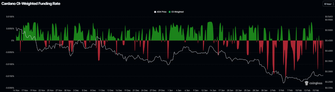 Además, los datos de la tasa de financiación ponderada por OI de Coinglass muestran que el número de traders que apuestan a que el precio de Cardano caerá más es mayor que aquellos que anticipan un aumento en el precio. La métrica se volvió negativa el miércoles y se sitúa en -0.0130%, acercándose a los niveles del 6 de febrero, cuando $ADA cayó bruscamente. La relación negativa sugiere que los cortos están pagando a los largos, lo que indica un sentimiento bajista hacia $ADA.