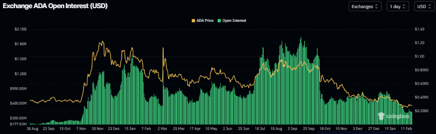 El interés abierto (OI) de futuros de Cardano cae a 436 millones de dólares el miércoles, habiendo estado en constante declive desde mediados de enero y acercándose al nivel de 407 millones de dólares del 12 de febrero. Esta caída en el OI refleja una disminución en la participación de los inversores y proyecta una perspectiva bajista.