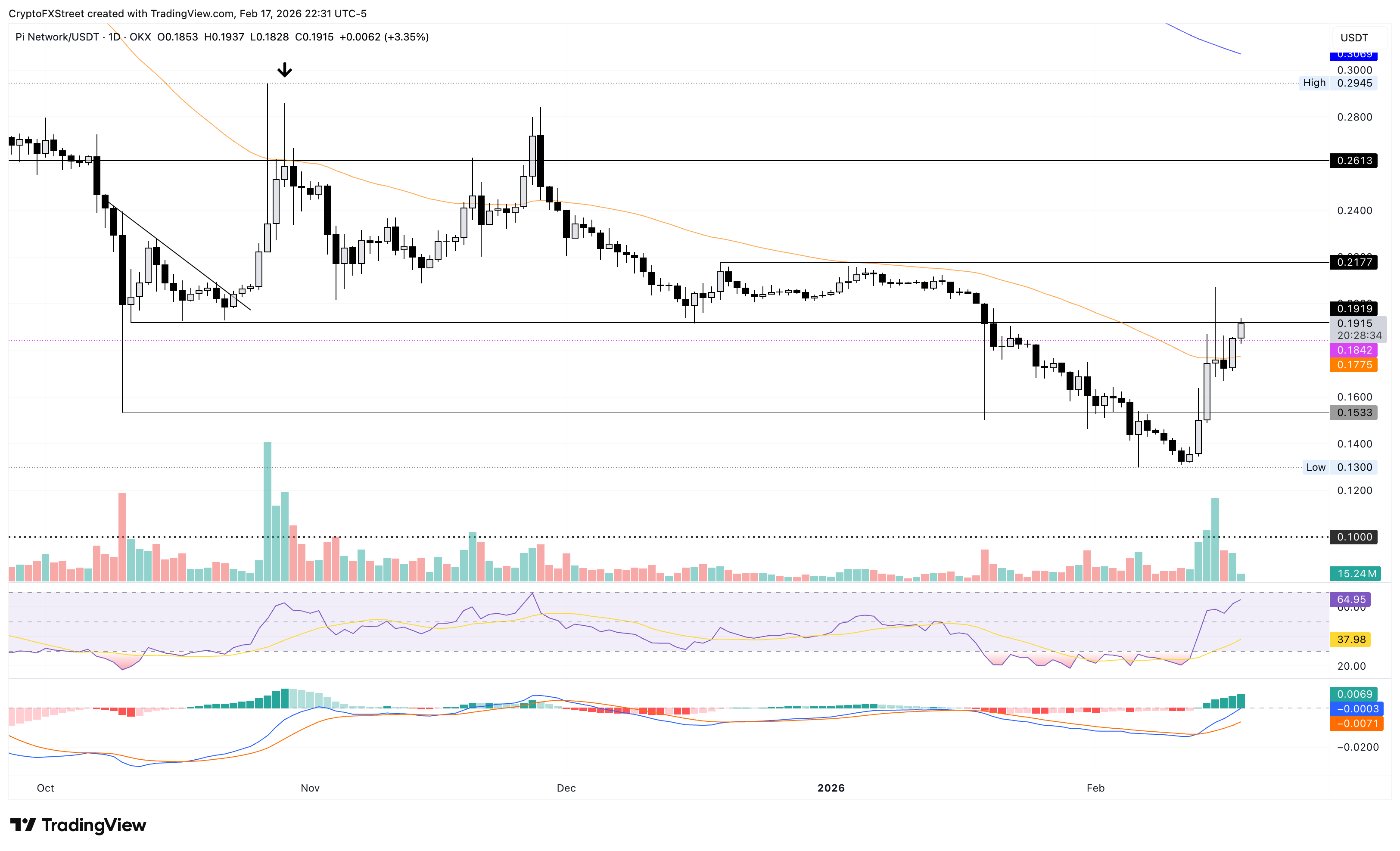 El token PI se está acercando al nivel de resistencia de 0.1919$ marcado por el mínimo del 11 de octubre, que anteriormente sirvió como soporte crucial en múltiples ocasiones. Un cierre decisivo por encima de este nivel podría extender el repunte hasta la resistencia de 0.2177$, alineándose con el máximo del 19 de diciembre.