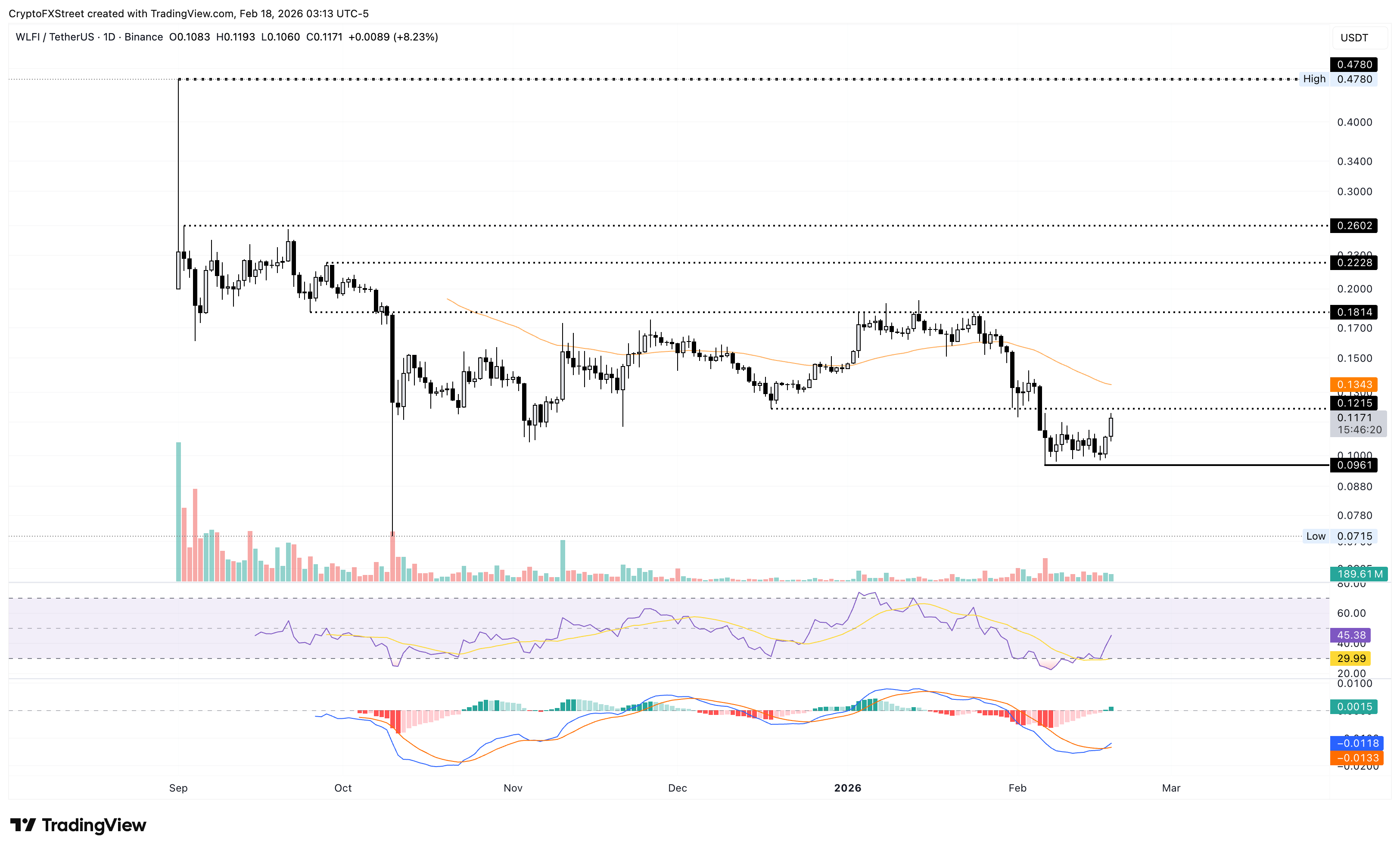 World Liberty Financial sube un 8% al momento de la publicación el miércoles, tras un aumento del 7% el día anterior. El segundo día de recuperación representa aproximadamente un 15% de ganancias hasta ahora esta semana después de casi 11 días de consolidación, señalando una reversión al alza.