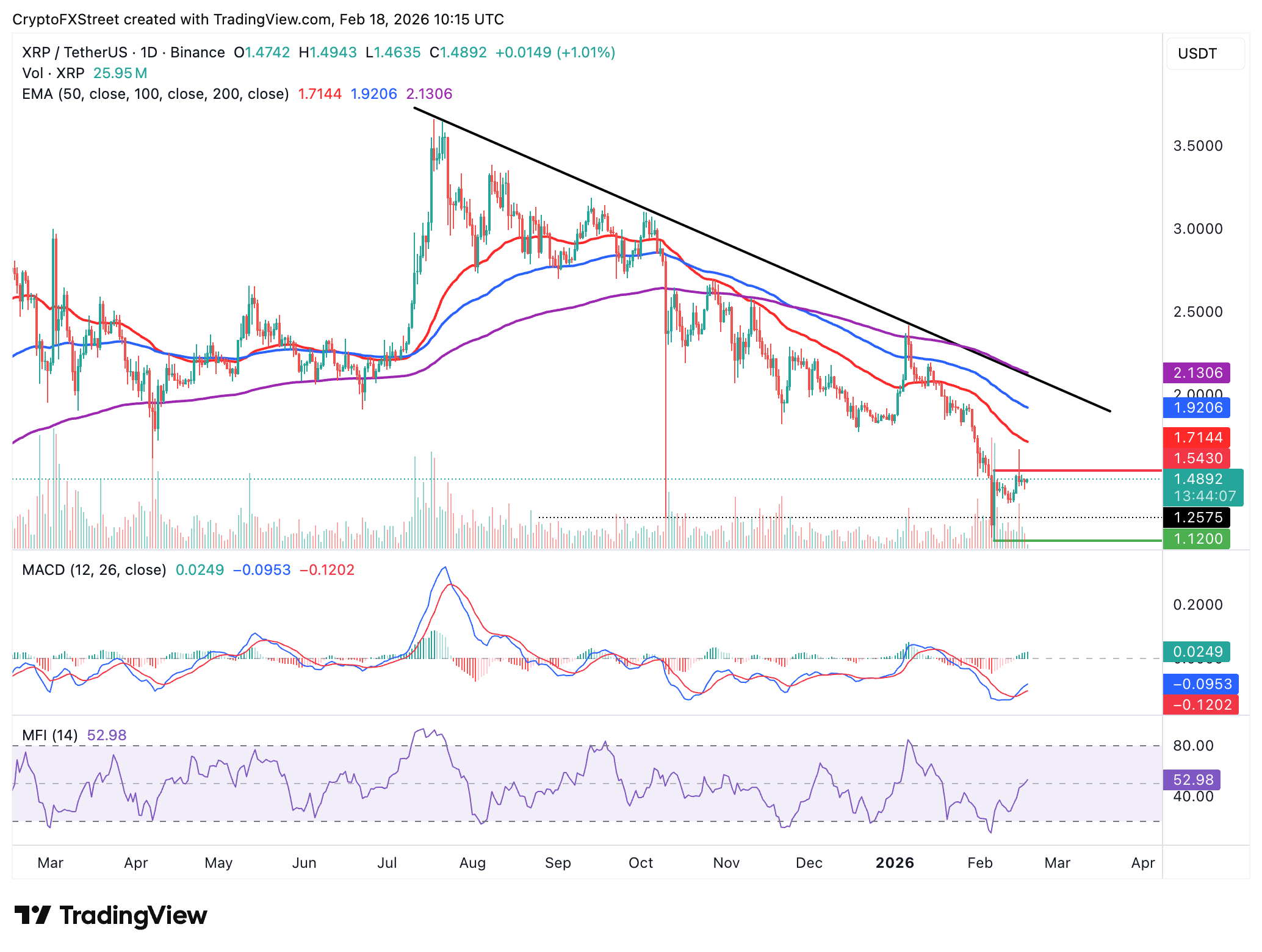 Los toros parecen listos para una ruptura por encima del obstáculo a corto plazo en 1.50$, apoyados por el aumento en el flujo de dinero hacia $XRP, como lo refleja el MFI que sube a 53. La EMA de 50 días en 1.71$ es un objetivo clave junto con la EMA de 100 días en 1.92$.