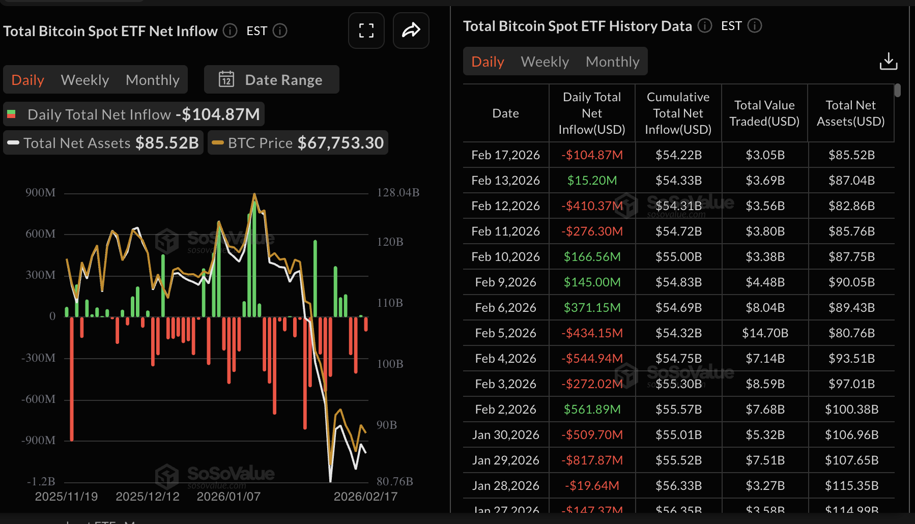 Al mismo tiempo, los fondos cotizados en bolsa (ETFs) de Bitcoin al contado pintan un panorama sombrío, como se refleja en aproximadamente 105 millones de dólares en salidas registradas el martes. Las entradas acumuladas se sitúan actualmente en 54.22 mil millones de dólares, con activos netos bajo gestión en 85.52 mil millones de dólares.
