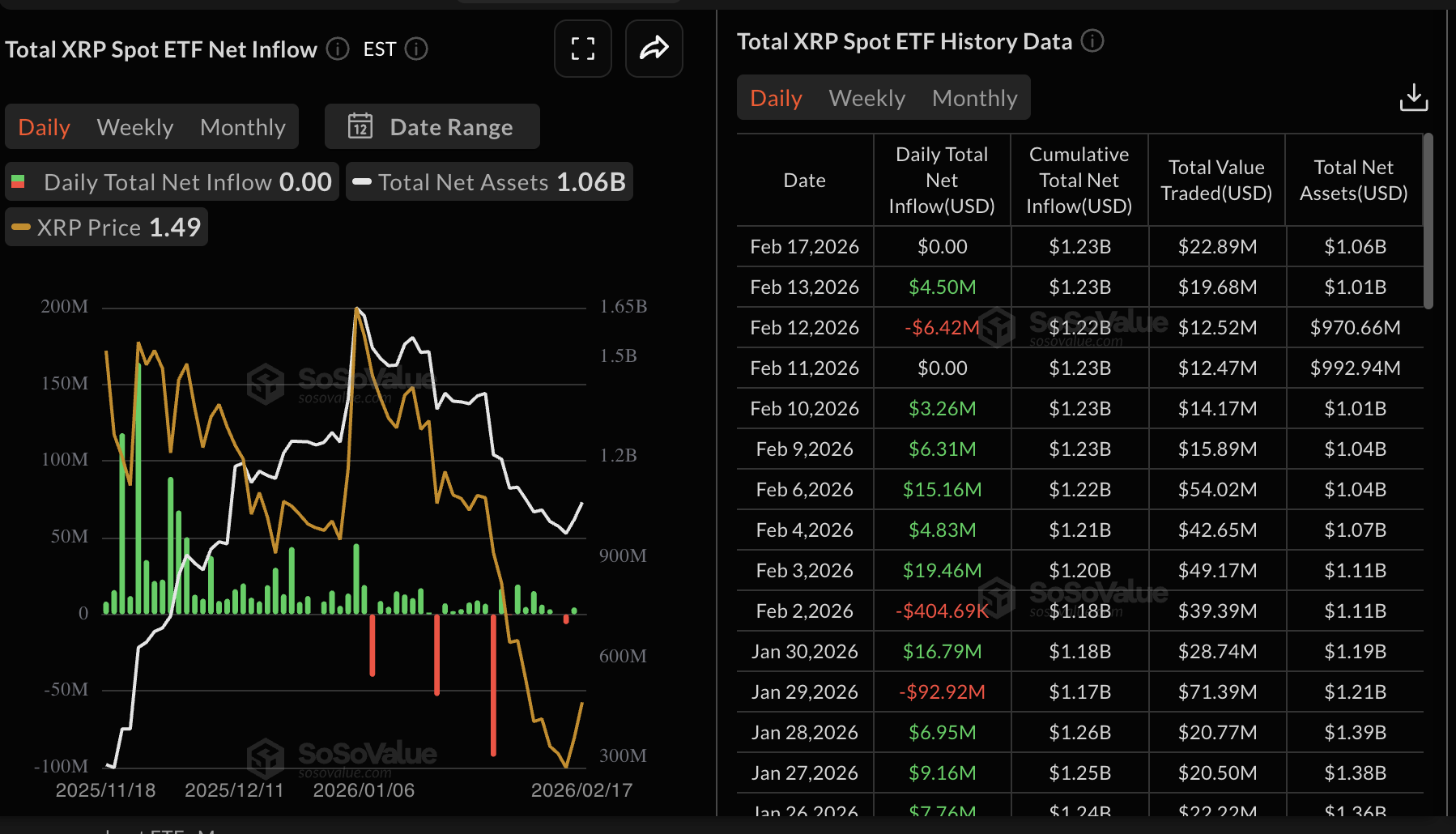 En cuanto a los ETFs de $XRP al contado, la actividad fue moderada el martes, sin flujos registrados, según los datos de SoSoValue. La entrada acumulada ahora se sitúa en 1.23 mil millones de dólares, con activos netos bajo gestión en 1.06 mil millones de dólares. Al igual que con $BTC y $ETH, los activos totales en ETFs relacionados con $XRP también han disminuido drásticamente después de alcanzar un máximo histórico de 1.65 mil millones de dólares el 5 de enero, lo que sugiere que el interés en los ETFs de $XRP al contado listados en EE. UU. ha disminuido gradualmente en las últimas semanas.