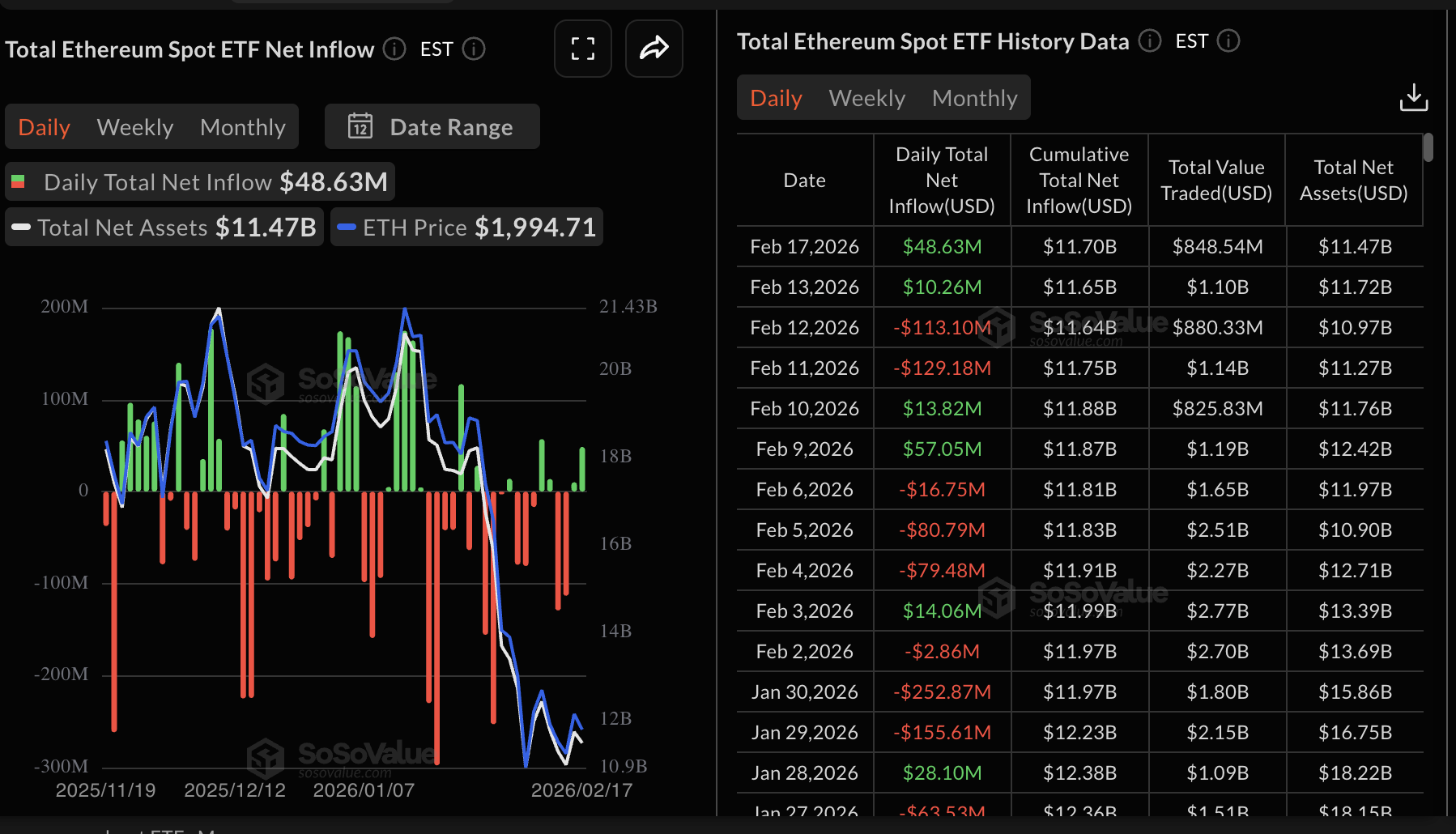 Ethereum, por otro lado, registró entradas de aproximadamente 49 millones de dólares el martes, superando tanto a Bitcoin como a $XRP. La entrada acumulada ahora se sitúa en 11.7 mil millones de dólares, con activos netos bajo gestión en 11.47 mil millones de dólares. Los activos netos totales se dispararon a un máximo histórico de 25.71 mil millones de dólares en agosto, lo que sugiere que el interés en los ETFs de $ETH también ha disminuido significativamente.