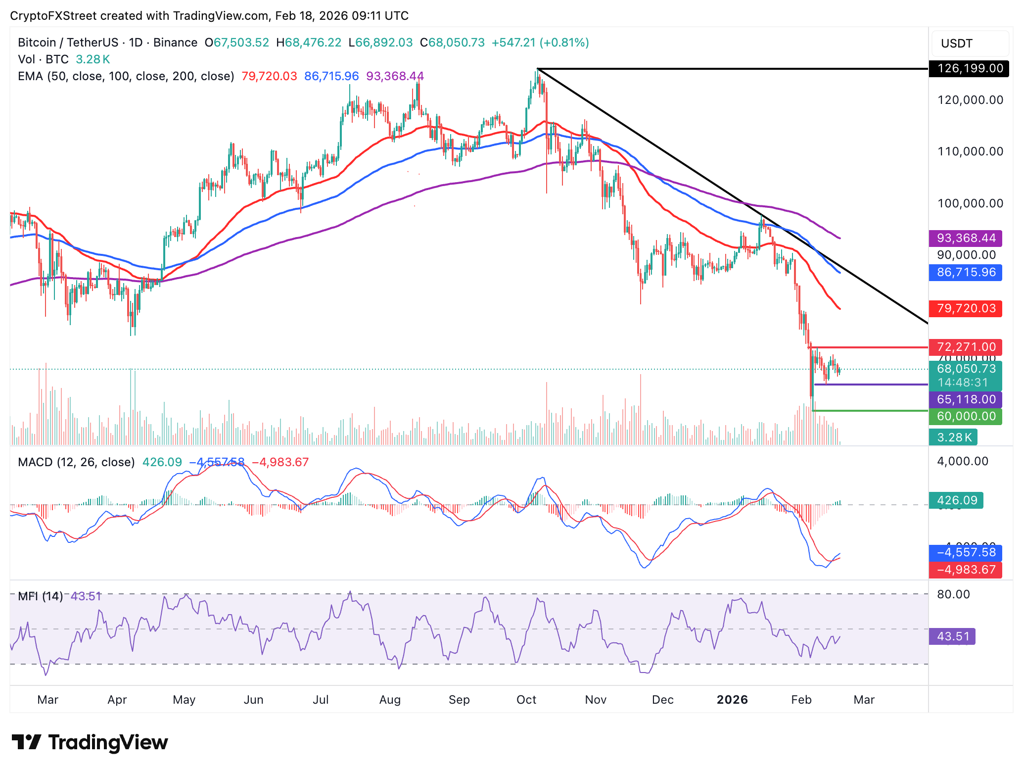 Al mismo tiempo, el Índice de Flujo de Dinero (MFI), un indicador que rastrea el flujo de dinero dentro y fuera de Bitcoin, está en 43 y subiendo hacia la línea media en el mismo gráfico. Una tendencia alcista continua indicaría un apetito por el riesgo constante y un aumento del impulso, apoyando la tesis alcista de Bitcoin.