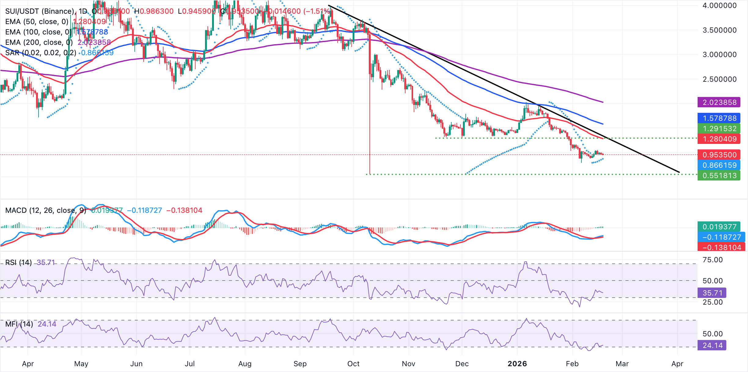 Sui cotiza a 0.95$ mientras se mantiene por debajo de la media móvil exponencial (EMA) de 50 días en 1.28$, preservando un sesgo bajista a medio plazo. La EMA de 100 días en 1.58$ y la EMA de 200 días en 2.02$ continúan descendiendo, manteniendo los rebotes contenidos.