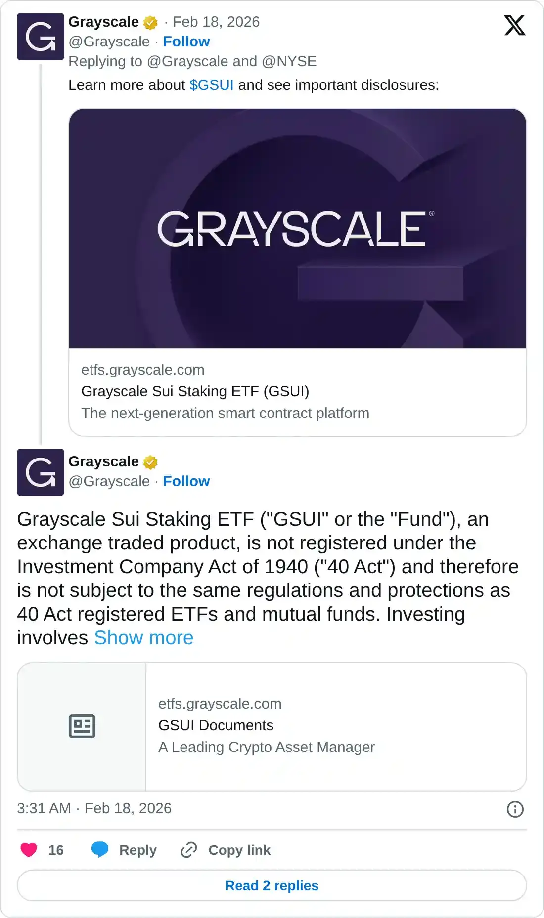 Grayscale declaró que "si bien una inversión en las acciones no es una inversión directa en $SUI, las acciones están diseñadas para proporcionar a los inversores una forma rentable y conveniente de obtener exposición a $SUI."
