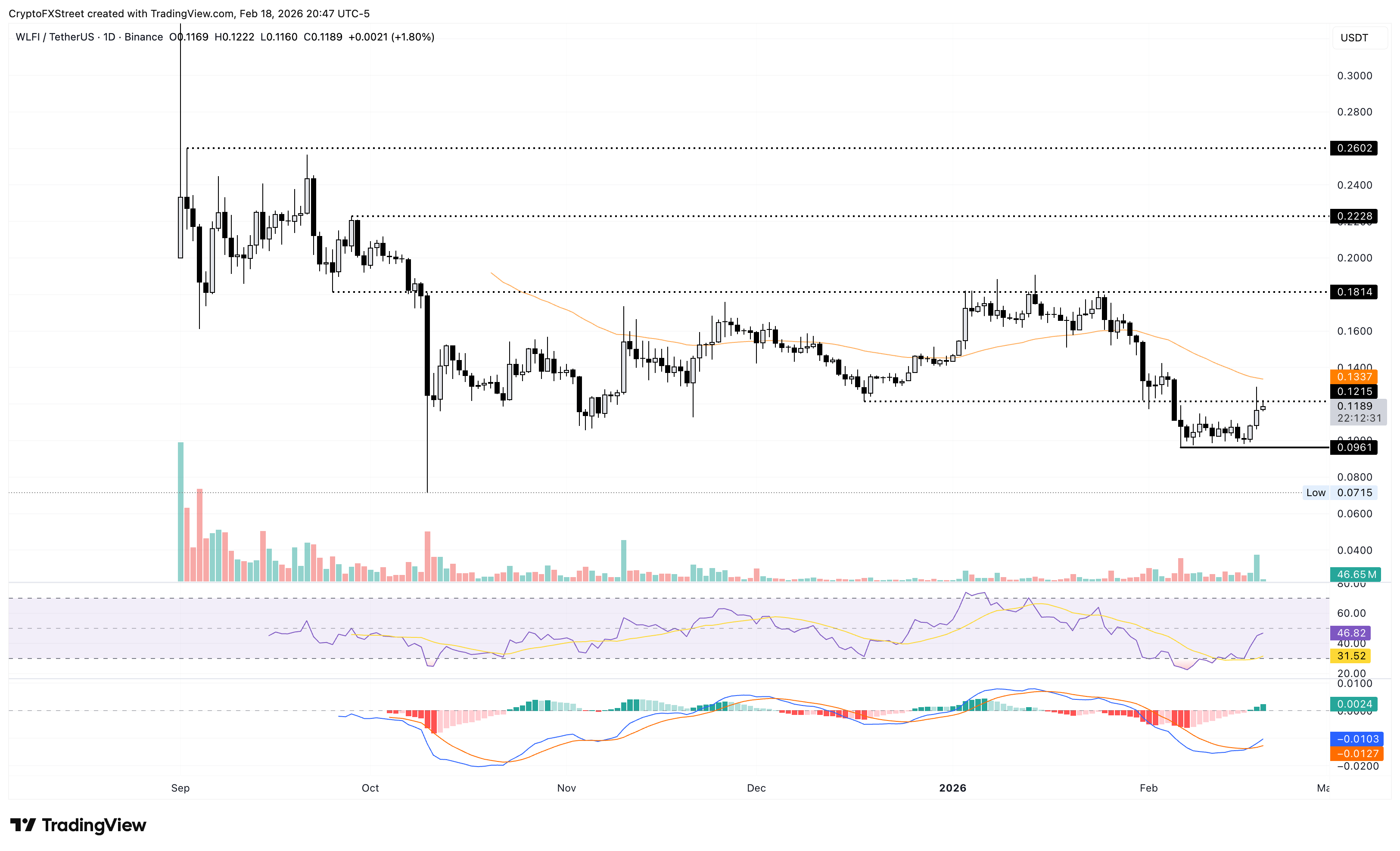 El token $WLFI encuentra resistencia en 0.1215$, alineándose con el mínimo del 18 de diciembre. Un cierre decisivo por encima de este nivel extendería el rally de $WLFI hasta la media móvil exponencial (EMA) de 50 días en 0.1337$.