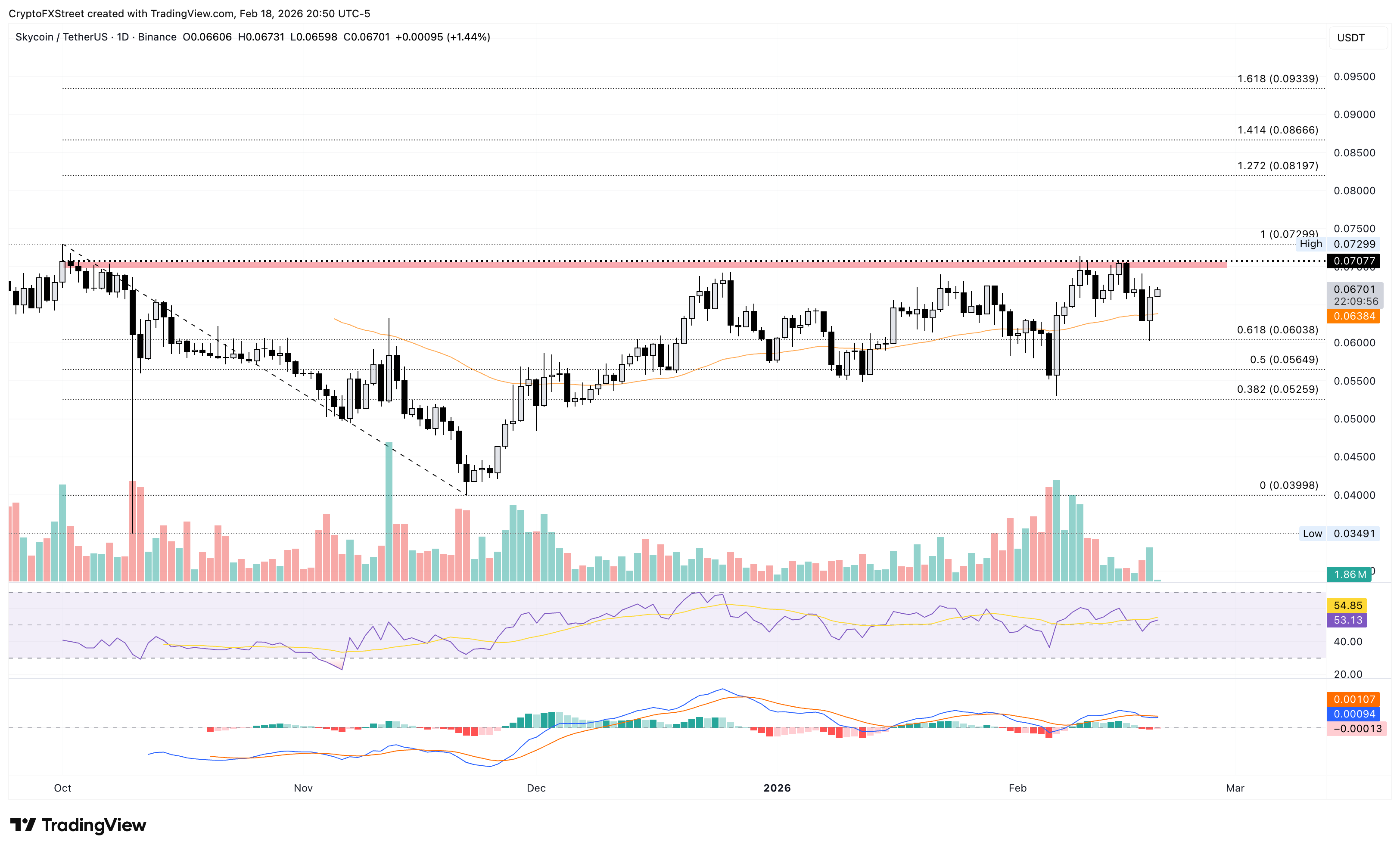 Por otro lado, si Sky cae por debajo de 0.06381$, podría extender la caída hasta el nivel de retroceso de Fibonacci del 61.8% en 0.06038$.
