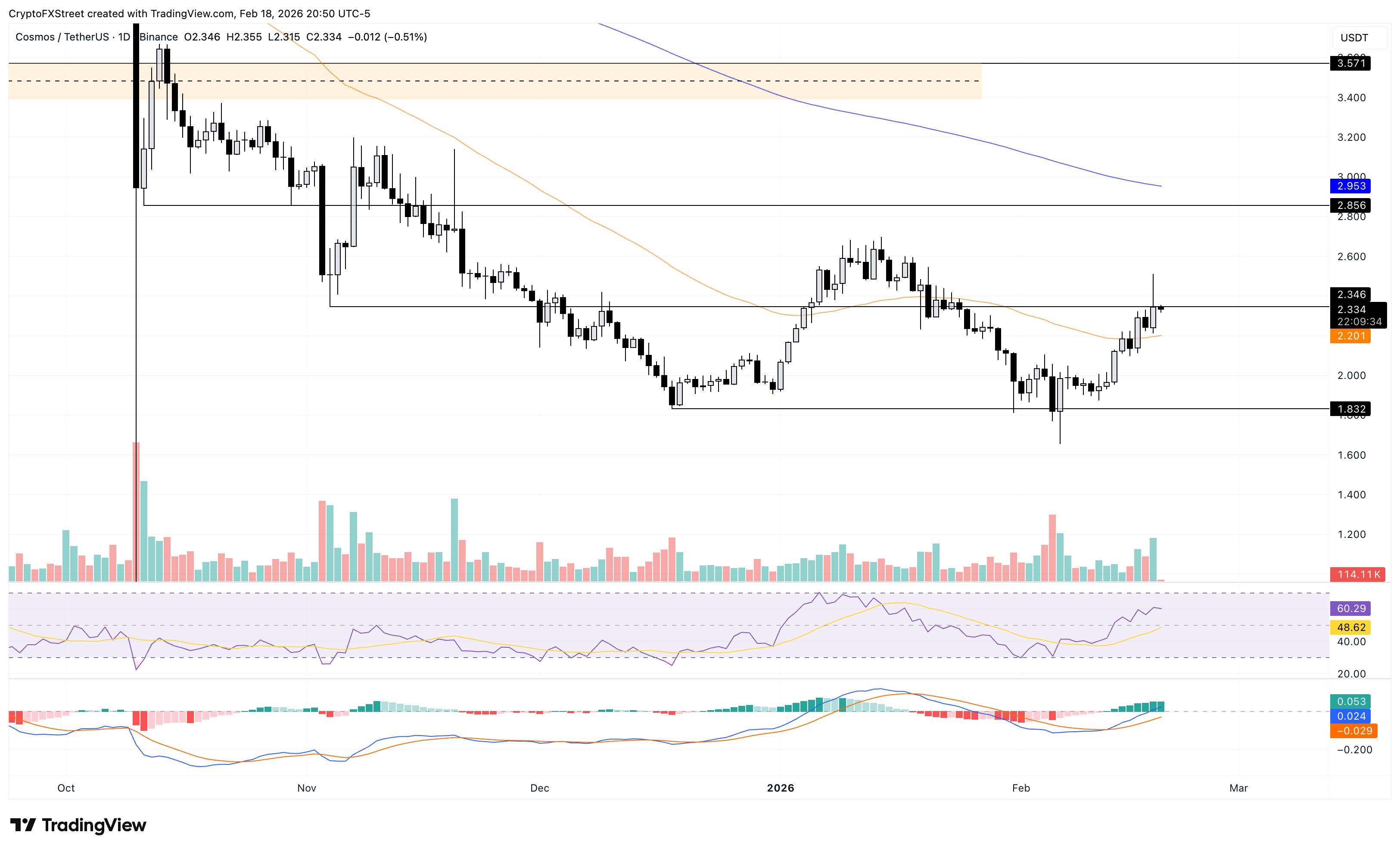 Cosmos se mantiene estable por encima del nivel de 2.300$ tras un rebote del 4% desde la EMA de 50 días en 2.201$ el día anterior. Sin embargo, el nivel de resistencia de 2.346$ marcado por el mínimo del 4 de noviembre limita la ganancia intradía.