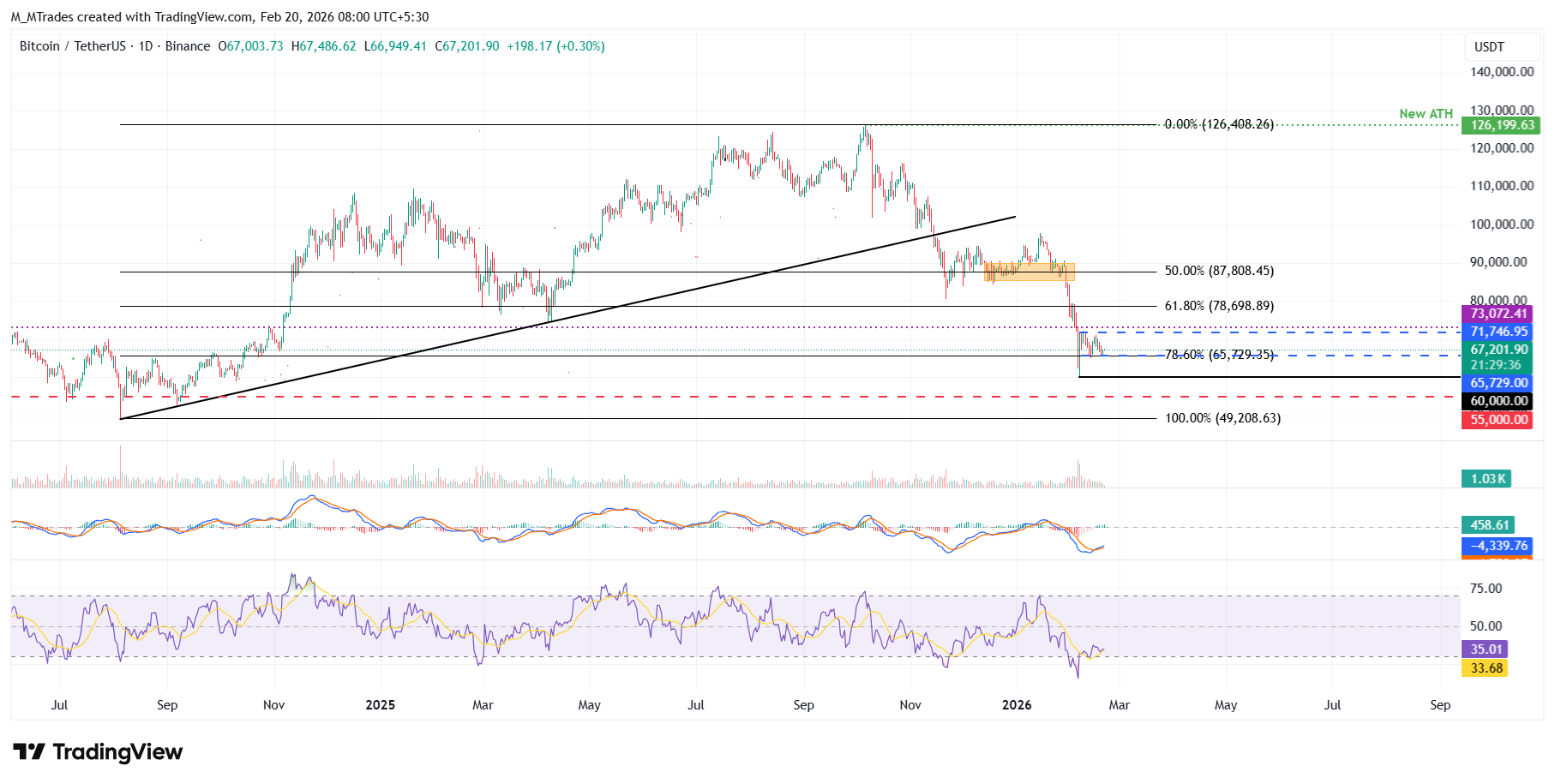 Si $BTC cierra por debajo del nivel inferior de consolidación en 65.729$ de manera diaria, podría extender la caída hacia el nivel de soporte clave en 60.000$.