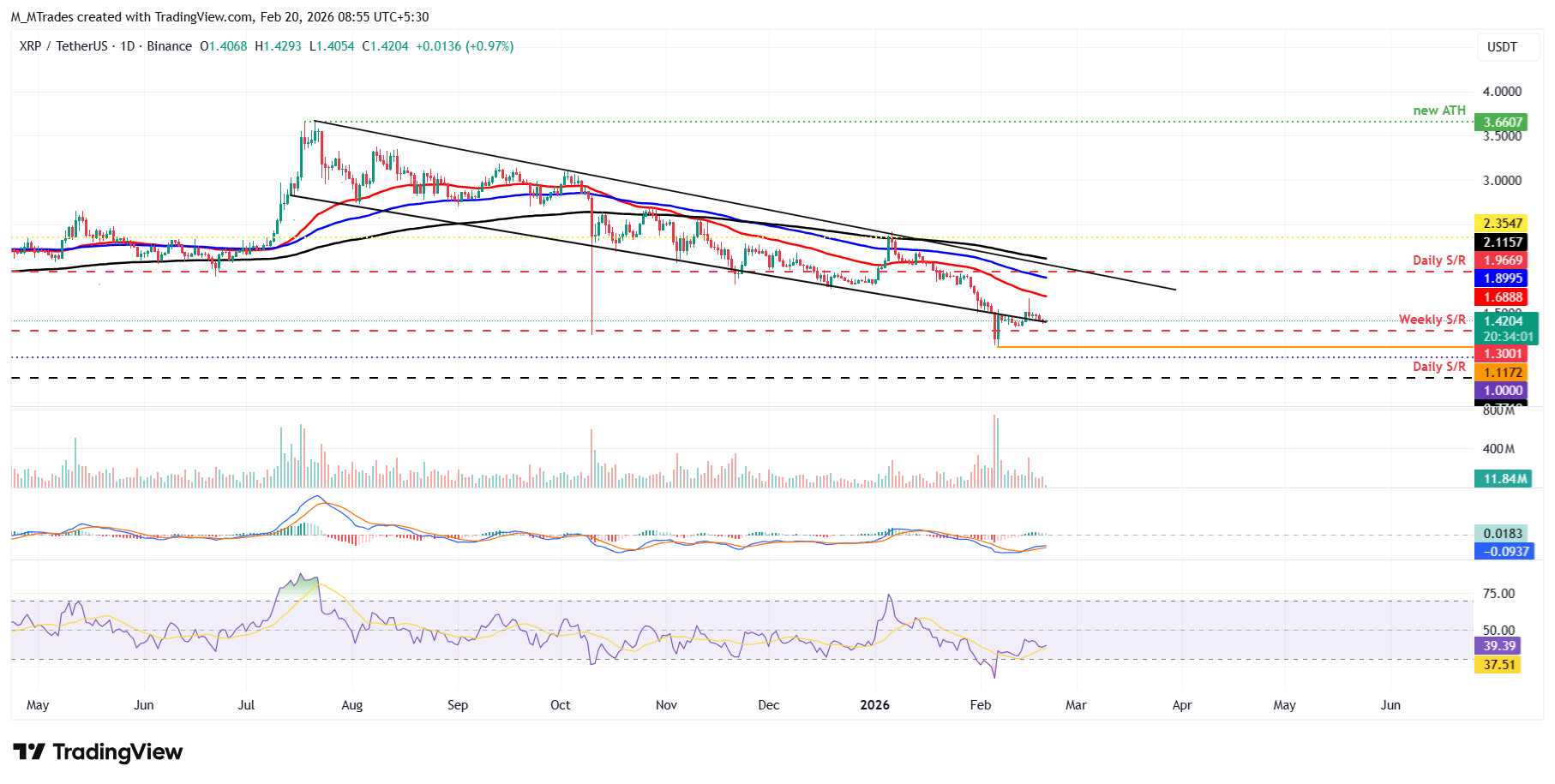 $XRP rompió por encima del límite inferior de la línea de tendencia de un cuña descendente el sábado y cayó ligeramente al día siguiente, encontrando soporte alrededor de ella. $XRP se ha estabilizado alrededor de esta línea de tendencia hasta ahora esta semana. Al momento de escribir el viernes, $XRP se cotiza a 1.42$.