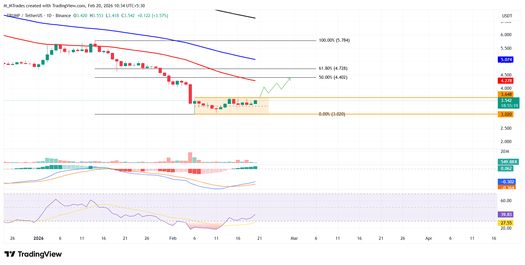 El precio oficial de Trump ha estado negociándose lateralmente entre 3.02$ y 3.64$ desde el 6 de febrero. A partir del viernes, $TRUMP se está negociando más alto, dirigiéndose hacia el límite superior de consolidación.