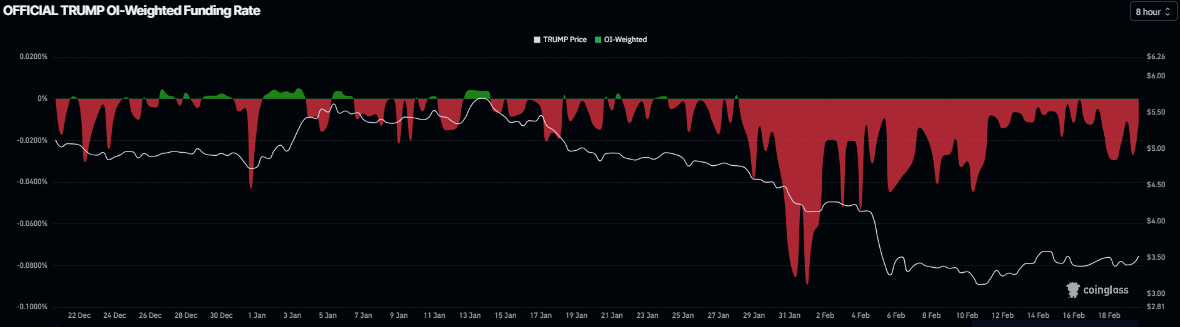 En el lado de los derivados, las tasas de financiación apoyan un sesgo bajista. Los datos de CoinGlass muestran que la tasa de financiación de $TRUMP ha estado en una tendencia negativa desde finales de enero, actualmente en -0.016% el viernes, indicando que las posiciones cortas están pagando a las posiciones largas y sugiriendo un sentimiento bajista.
