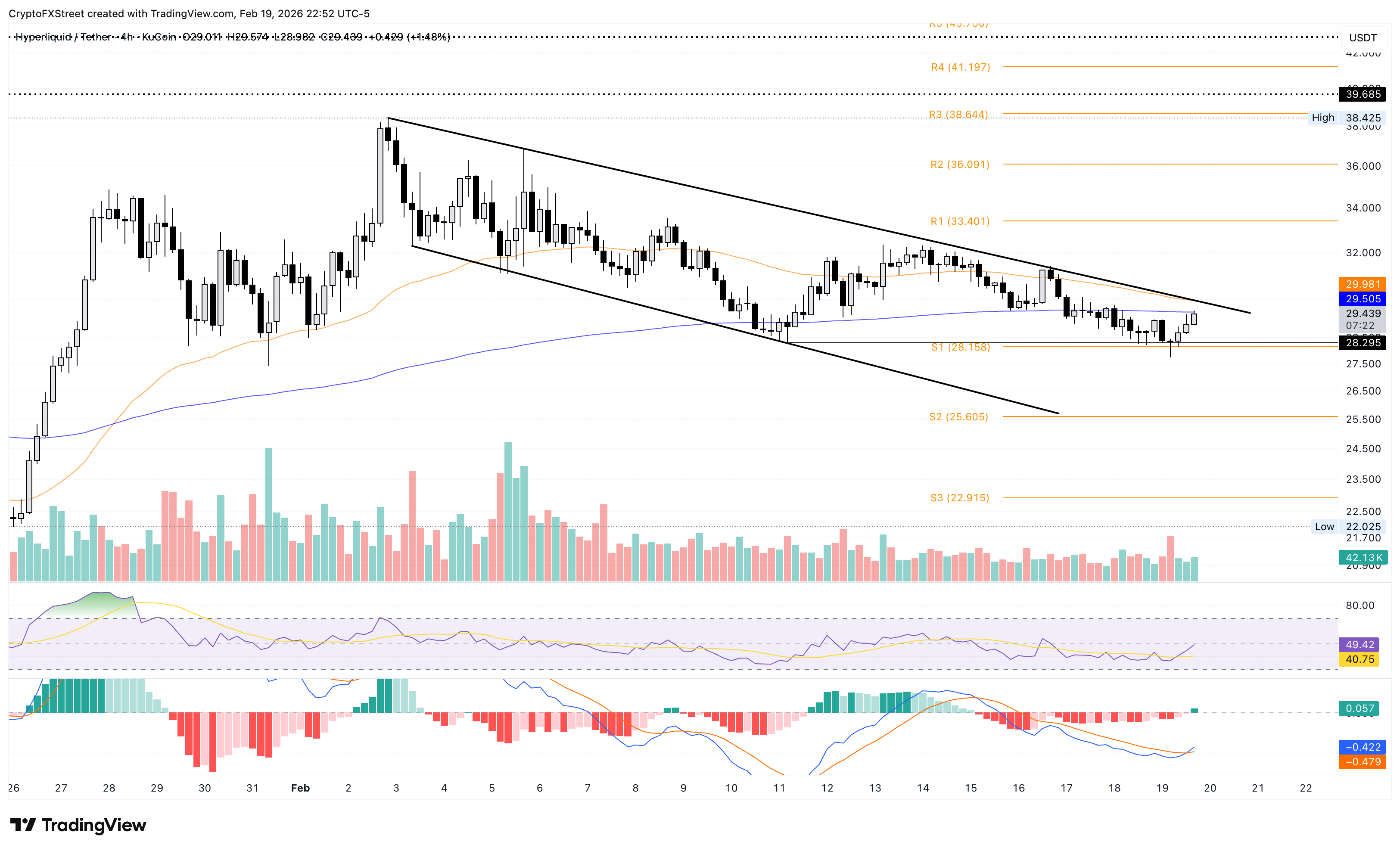 La resistencia crucial para la recuperación de $HYPE se encuentra en la confluencia de la EMA de 50 periodos en 29.95$ y la línea de tendencia descendente cerca de 30.00$, que conecta los máximos del 2 de febrero y del 16 de febrero.
