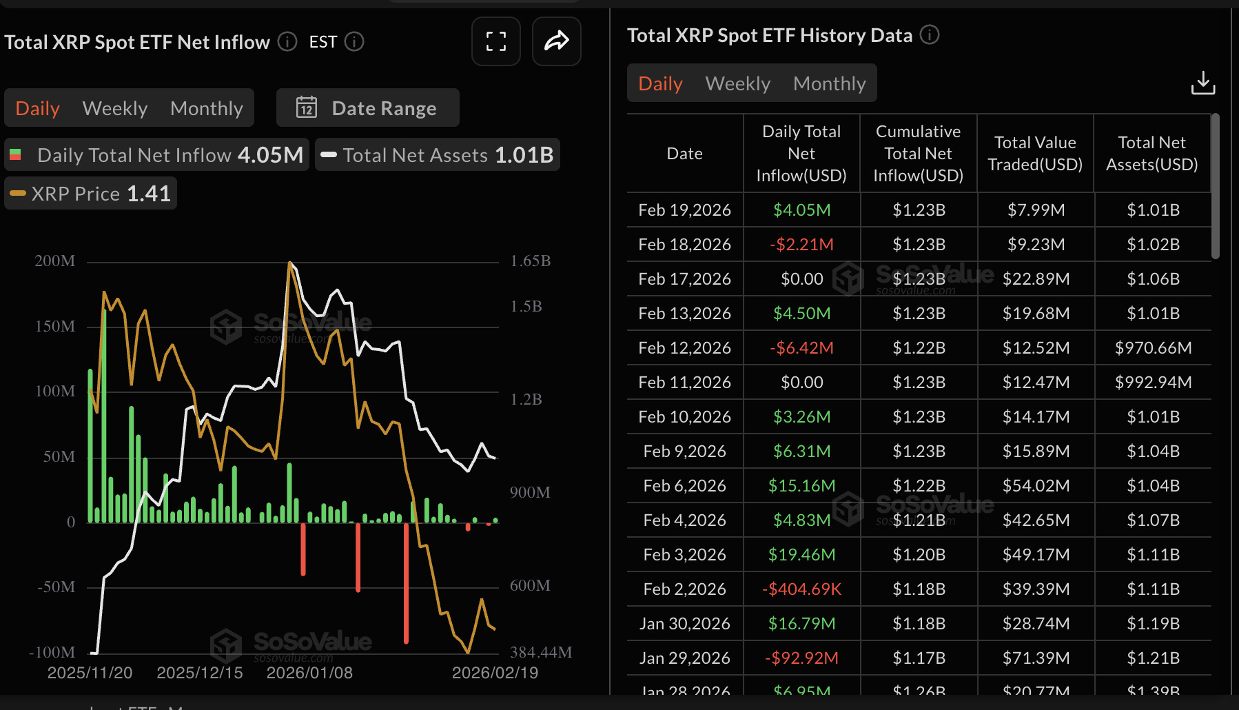 Mientras tanto, los Fondos Cotizados en Bolsa (ETFs) de $XRP al contado pintan un panorama diferente, tras el regreso de las entradas el jueves. Los ETFs de $XRP al contado listados en EE.UU. atrajeron aproximadamente 4 millones de dólares en depósitos, llevando las entradas acumuladas a 1.23 mil millones de dólares y los activos totales bajo gestión a 1.01 mil millones de dólares.