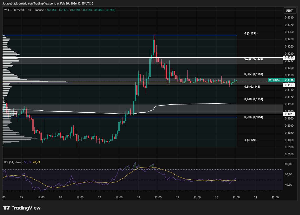 El miércoles 18 de febrero, previo a la apertura del mercado estadounidense, World Liberty Financial ($WLFI) alcanzó un máximo diario cercano a los $0,1296. Sin embargo, tras el inicio de la sesión americana, el activo registró una corrección cercana al 10,8%, llevando el precio hasta los $0,1156 y dando paso posteriormente a una fase de lateralización que, al momento de la redacción, ha marcado un mínimo en torno a los $0,1148.
