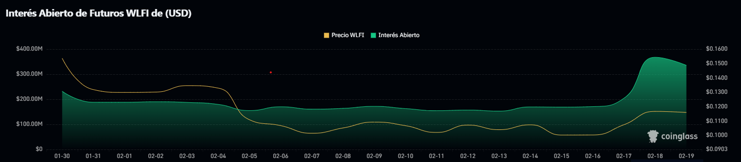 El gráfico del interés abierto de $WLFI muestra una etapa de lateralización previa a su reciente recuperación. A finales de enero, el interés abierto se situaba cerca de $230M, mientras el precio cotizaba alrededor de $0,15.