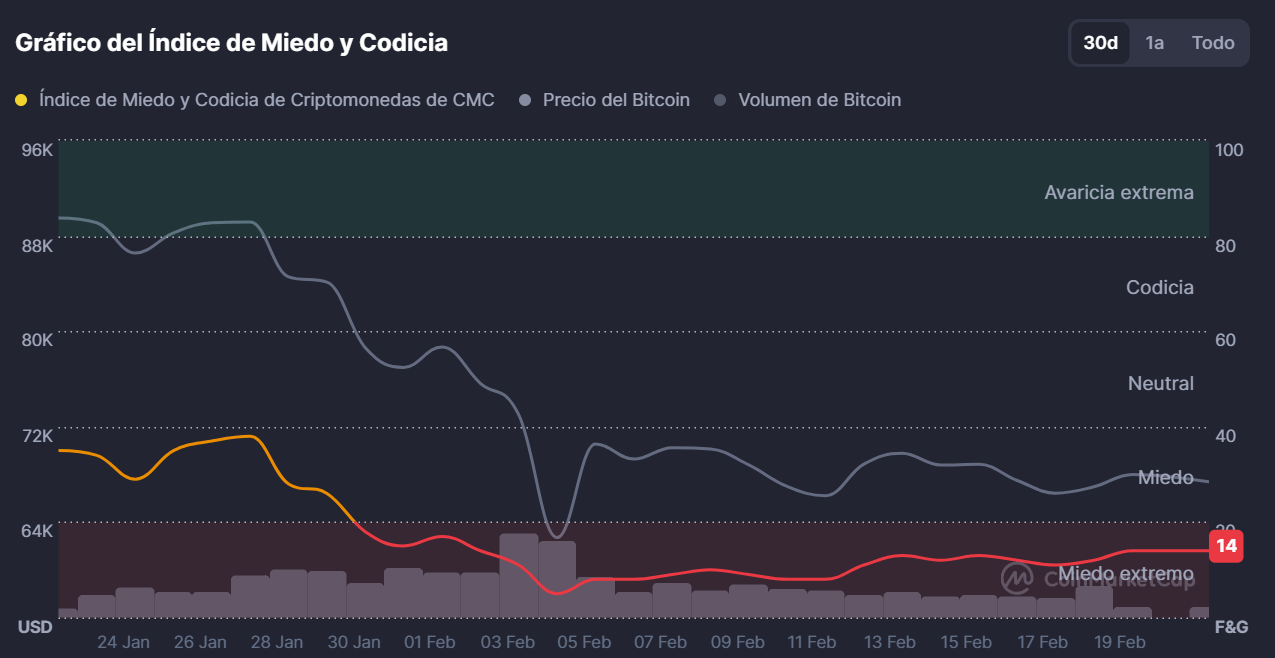 El Índice de Miedo y Codicia se sitúa en 14 puntos, dentro de la zona de miedo extremo, lo que refleja un mercado dominado por la cautela y la aversión al riesgo. En las últimas semanas, el sentimiento se deterioró en paralelo a la debilidad del precio de BTC, evidenciando una contracción de la confianza y menor actividad especulativa.