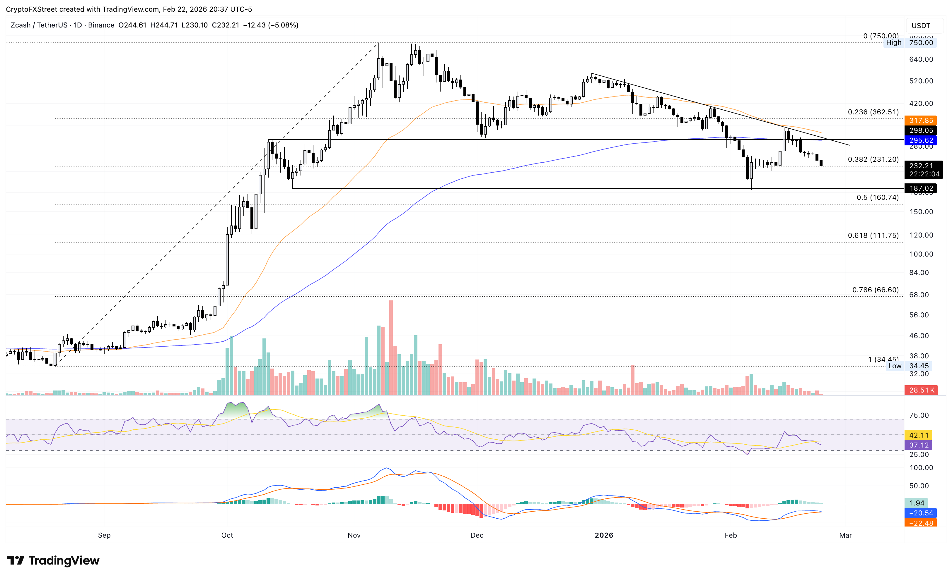 Zcash cotiza por debajo de 250$, cayendo un 5% en el momento de escribir este artículo el lunes, extendiendo la pérdida del 18% de la semana anterior y llevando el total a aproximadamente el 30%. Sin embargo, el nivel de retroceso de Fibonacci del 38.2% en 231$, medido desde el mínimo del 20 de agosto en 34.45$ hasta el máximo del 7 de noviembre en 750$ en el gráfico logarítmico diario, sirve como soporte inmediato.