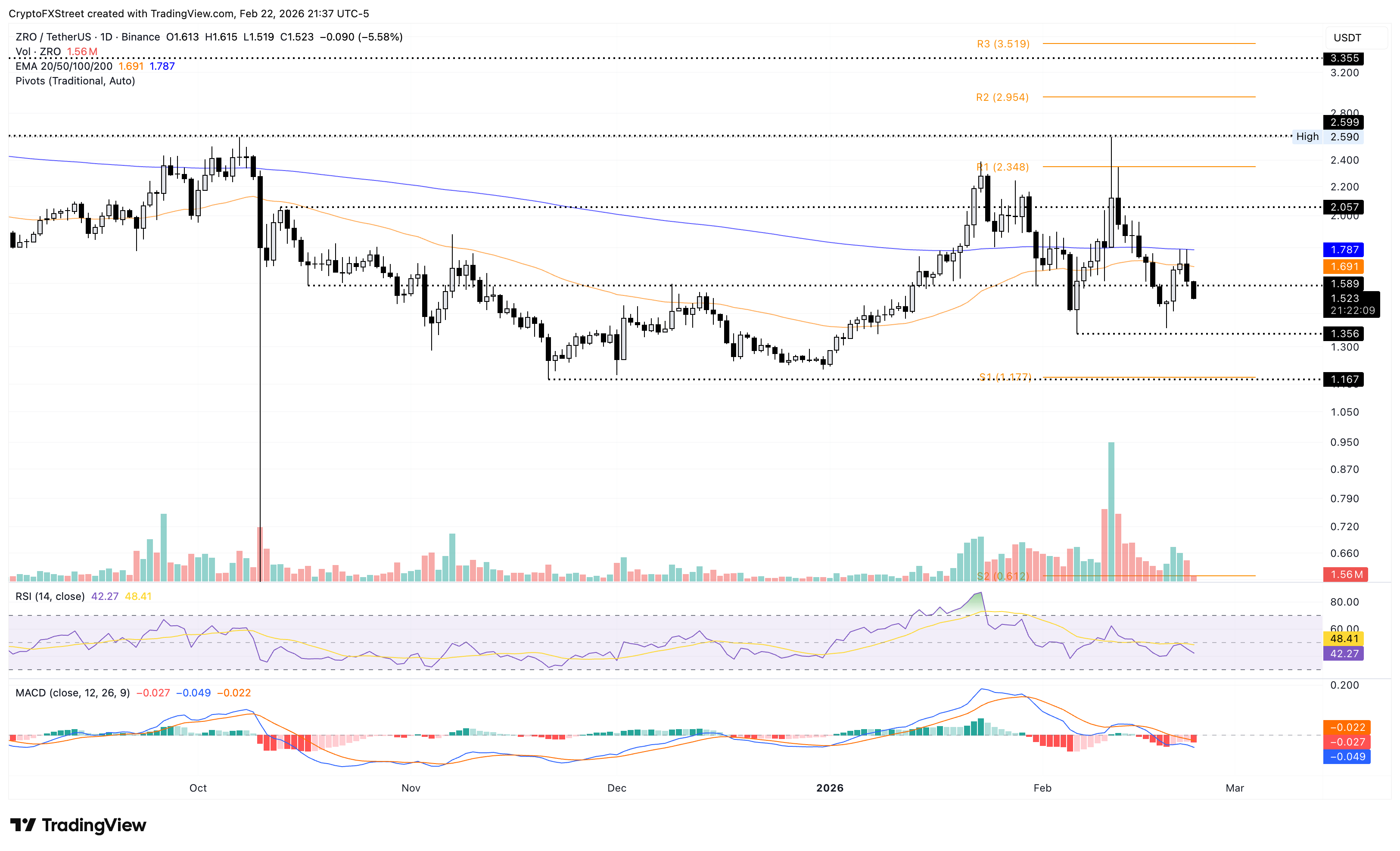 LayerZero cae más de un 5% en el momento de escribir este artículo el lunes, acercándose al nivel de soporte psicológico de 1.500$. El token $ZRO se negocia por debajo de las EMAs de 50 y 200 días, que están en una alineación bajista, reflejando presión a la baja.