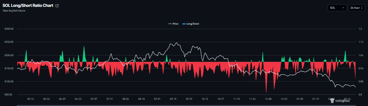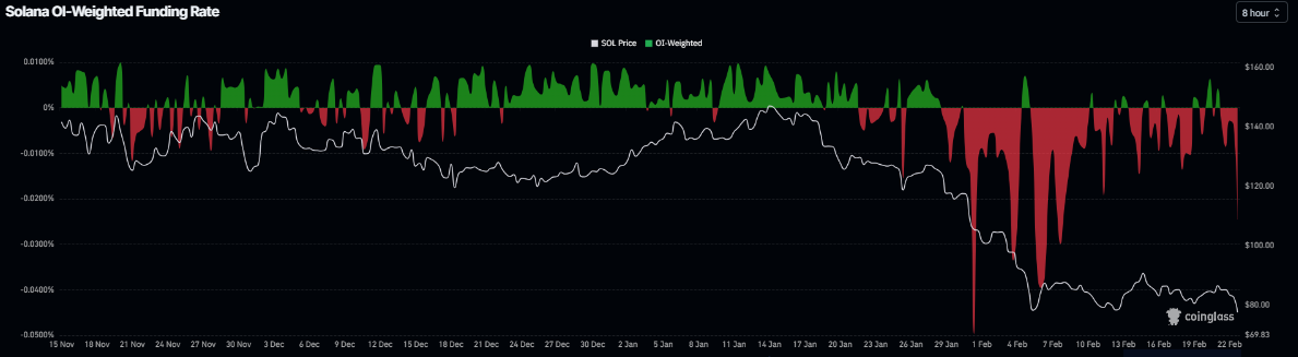 Además, las tasas de financiación para $SOL también apoyan una perspectiva bajista. Los datos de CoinGlass muestran que la tasa de financiación de $SOL se volvió negativa el sábado y actualmente se sitúa en -0.0245% el lunes, acercándose al nivel visto durante la caída del precio del 6 de febrero. Esta tasa negativa indica que las posiciones cortas están pagando a las posiciones largas y sugiere un sentimiento bajista.