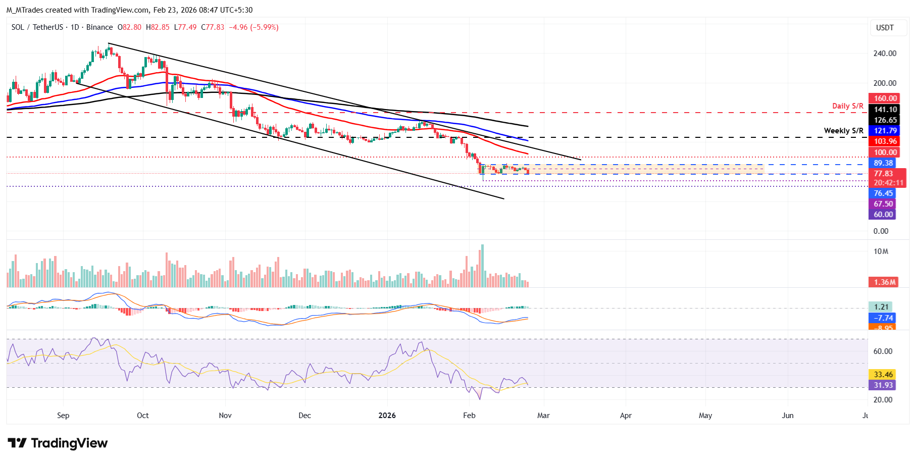 Si $SOL cierra por debajo del límite inferior de consolidación en 76.45$ de manera diaria, podría extender más pérdidas hacia el mínimo del 6 de febrero en 67.50$.