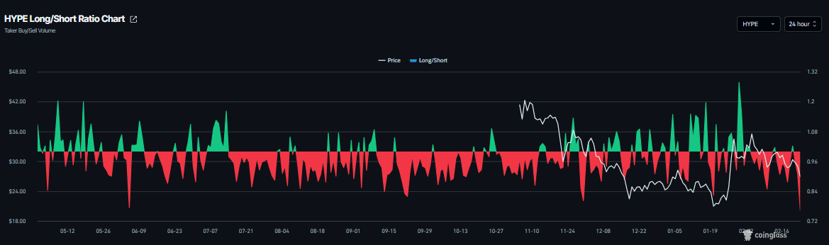 El ratio de largos a cortos de CoinGlass para $HYPE se sitúa en 0,76 el lunes, el nivel más bajo en un mes. Este ratio, al estar por debajo de uno, refleja un sentimiento bajista en el mercado, ya que más traders están apostando a que el precio del activo caerá.