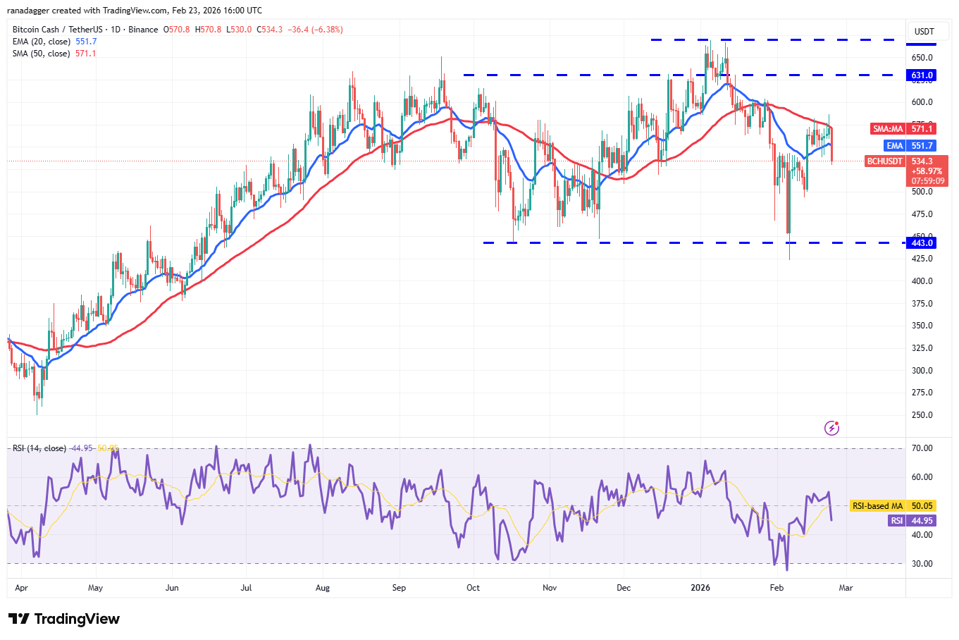 Los compradores impulsaron a Bitcoin Cash ($BCH) por encima de la SMA de 50 días (571 dólares) el domingo, pero no pudieron mantener los niveles superiores.