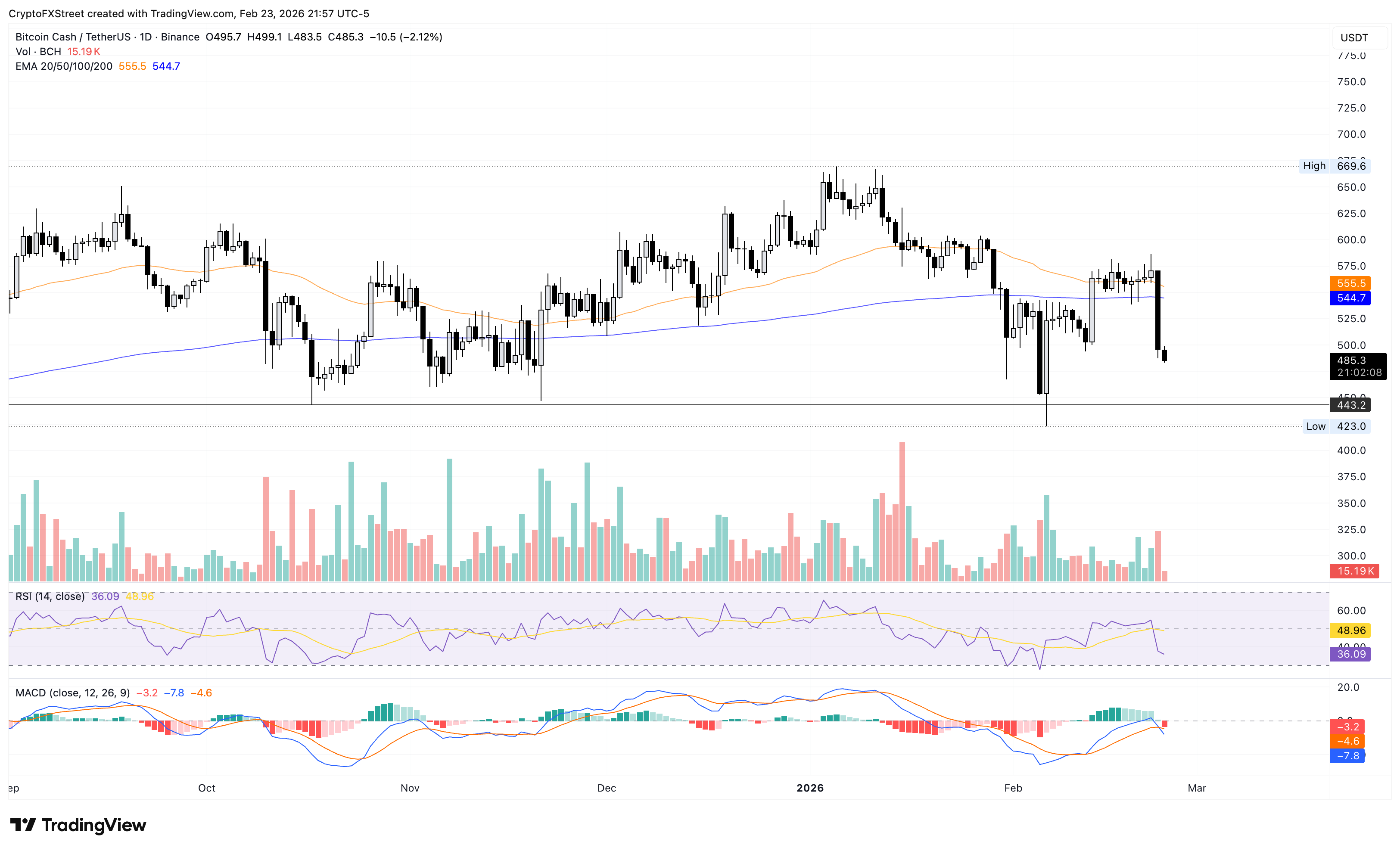 Bitcoin Cash está cotizando por debajo de 500$ en el momento de escribir el martes, tras una caída del 13% el día anterior. La altcoin está cotizando por debajo de su media móvil exponencial (EMA) de 200 días en 544$, mientras que la EMA de 50 días en pendiente descendente está en 555$, arriesgando un posible cruce mortal.