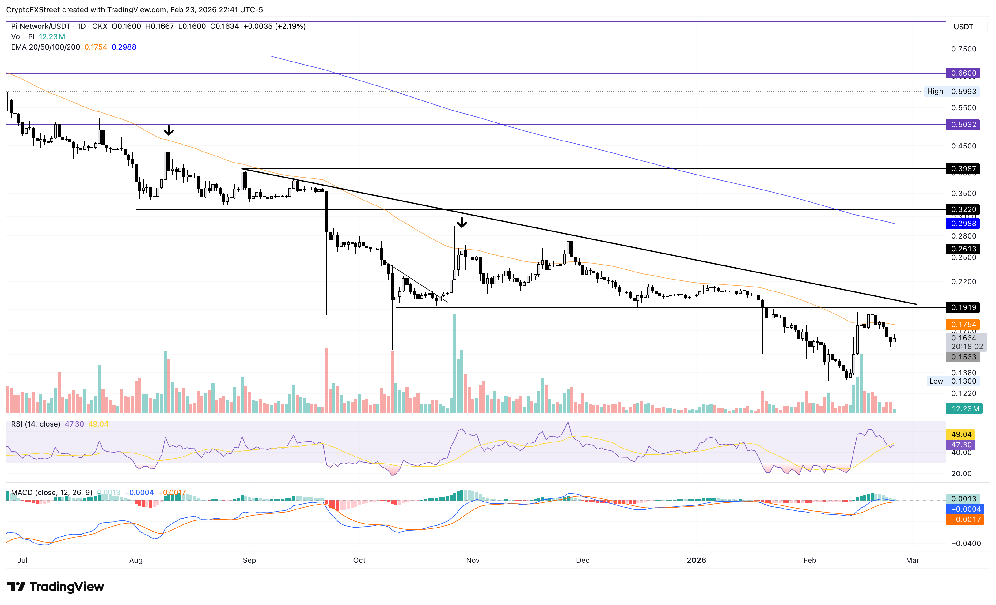 A la baja, si el token PI supera el nivel de soporte de 0.1533 $ con un cierre diario, podría amenazar el mínimo histórico de 0.1300 $ del 6 de febrero.