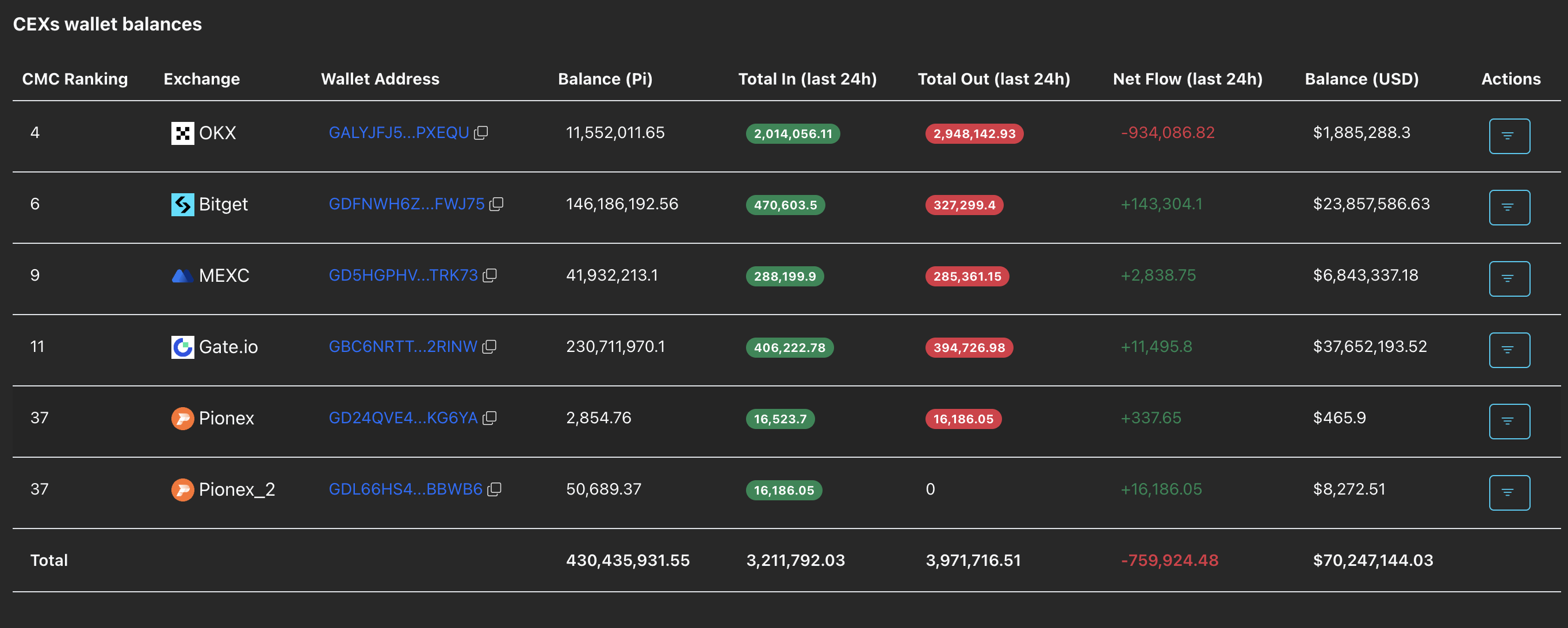 Los datos de PiScan muestran que los intercambios verificados por Know-Your-Business (KYB) registraron una salida de 759.924 tokens PI en las últimas 24 horas. Típicamente, las salidas de los CEXs señalan una renovada demanda de los inversores. En el caso de Pi Network, la salida refleja a los inversores capitalizando la caída en anticipación de una recuperación prolongada.