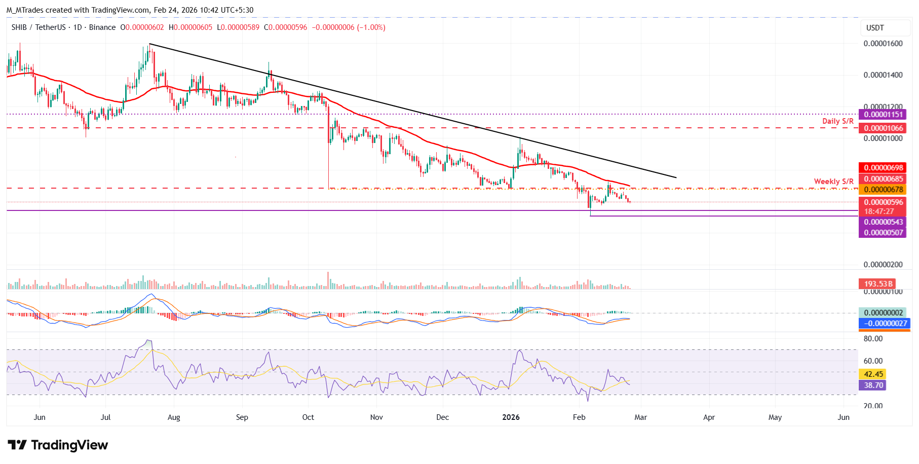 Si $SHIB continúa su tendencia a la baja, podría extender la corrección hacia el mínimo del 6 de febrero de 0.0000050$.