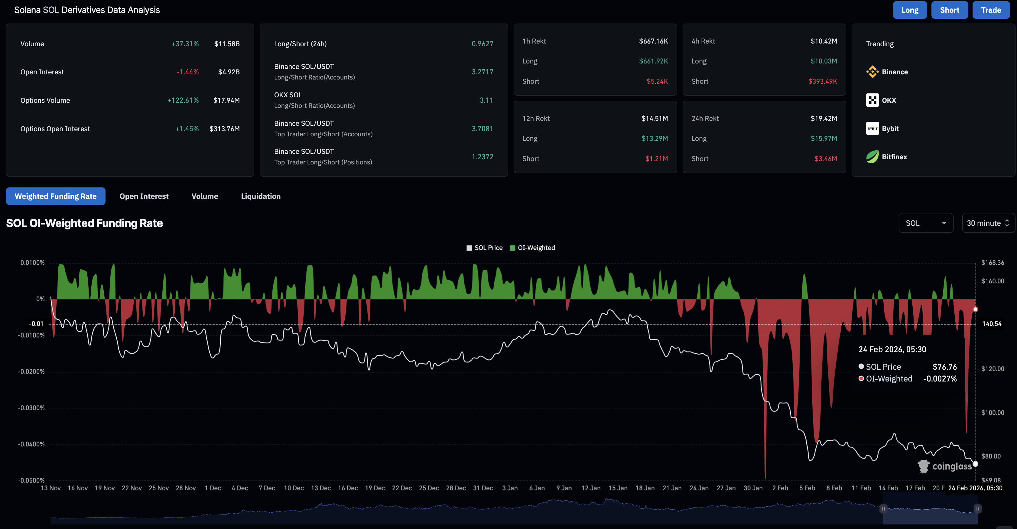 Solana se acerca al nivel de retroceso de Fibonacci del 23.6% basado en tendencias en 75.74$, medido desde el máximo del 13 de enero en 148.74$ hasta el máximo del 15 de febrero en 91.26$, incluyendo el mínimo del 6 de febrero en 67.50$.
