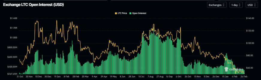 El OI de futuros de Litecoin cae a 328.60 millones de dólares el martes, habiendo estado en constante declive desde mediados de enero. Esta caída en el OI refleja una disminución en la participación de los inversores y proyecta un panorama bajista.
