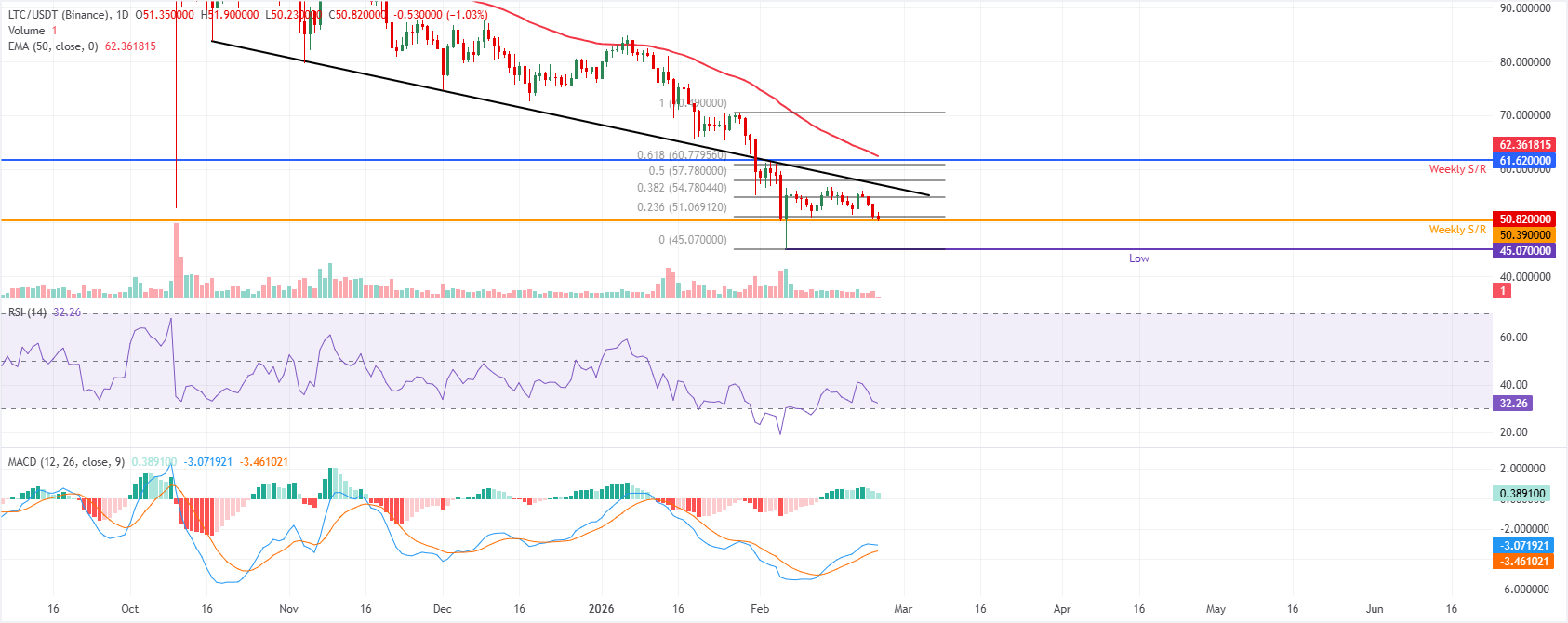 Pronóstico del precio de Litecoin: los bajistas de $LTC apuntan al nivel de 45$