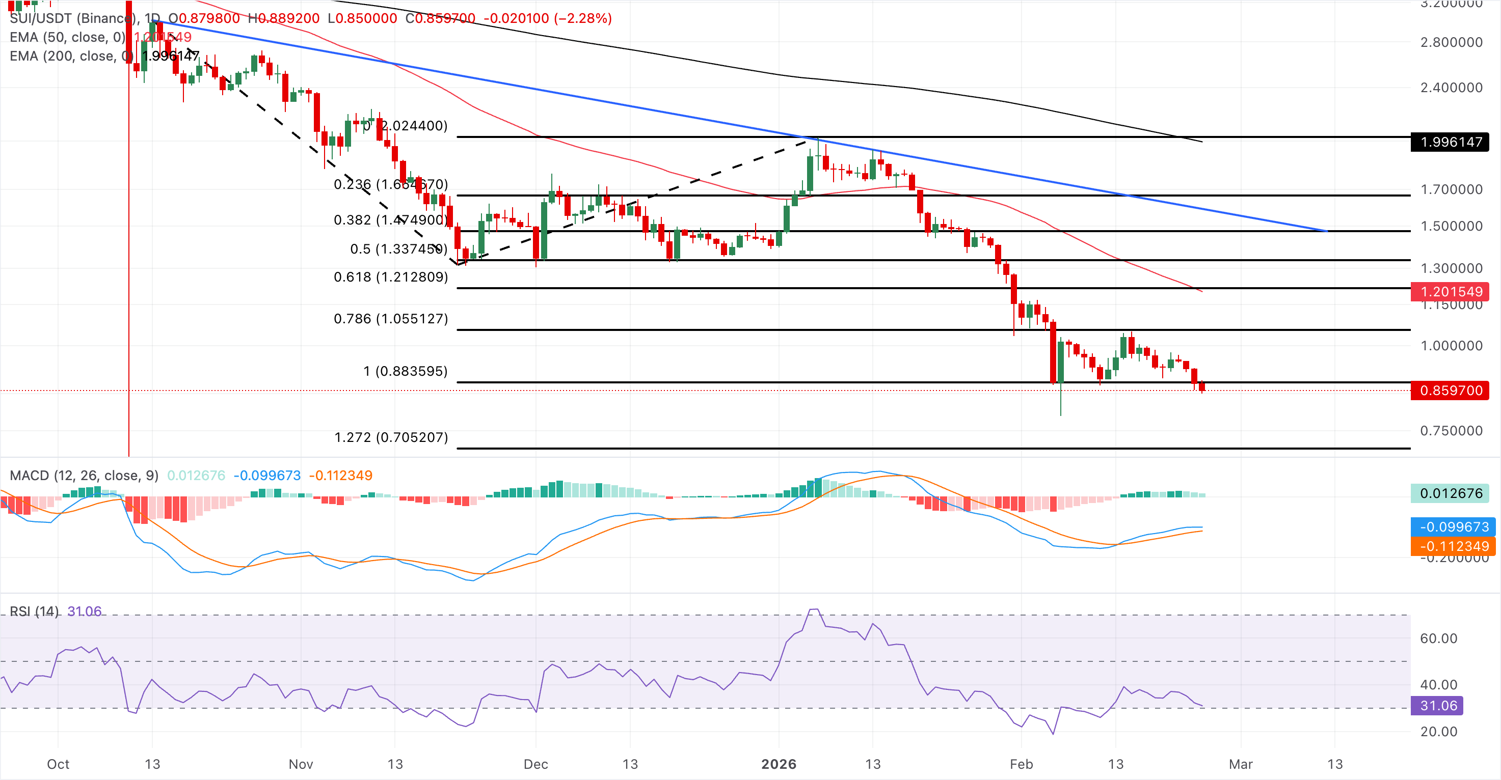 $SUI ha bajado un 3% en el momento de escribir el martes, extendiendo su declive por cuarto día consecutivo y cotizando por debajo del nivel de soporte de 0.88$, apuntando a una pierna inferior. La pendiente descendente de las Medias Móviles Exponenciales (EMAs) de 50 y 200 días confirma el sesgo bajista a largo plazo.