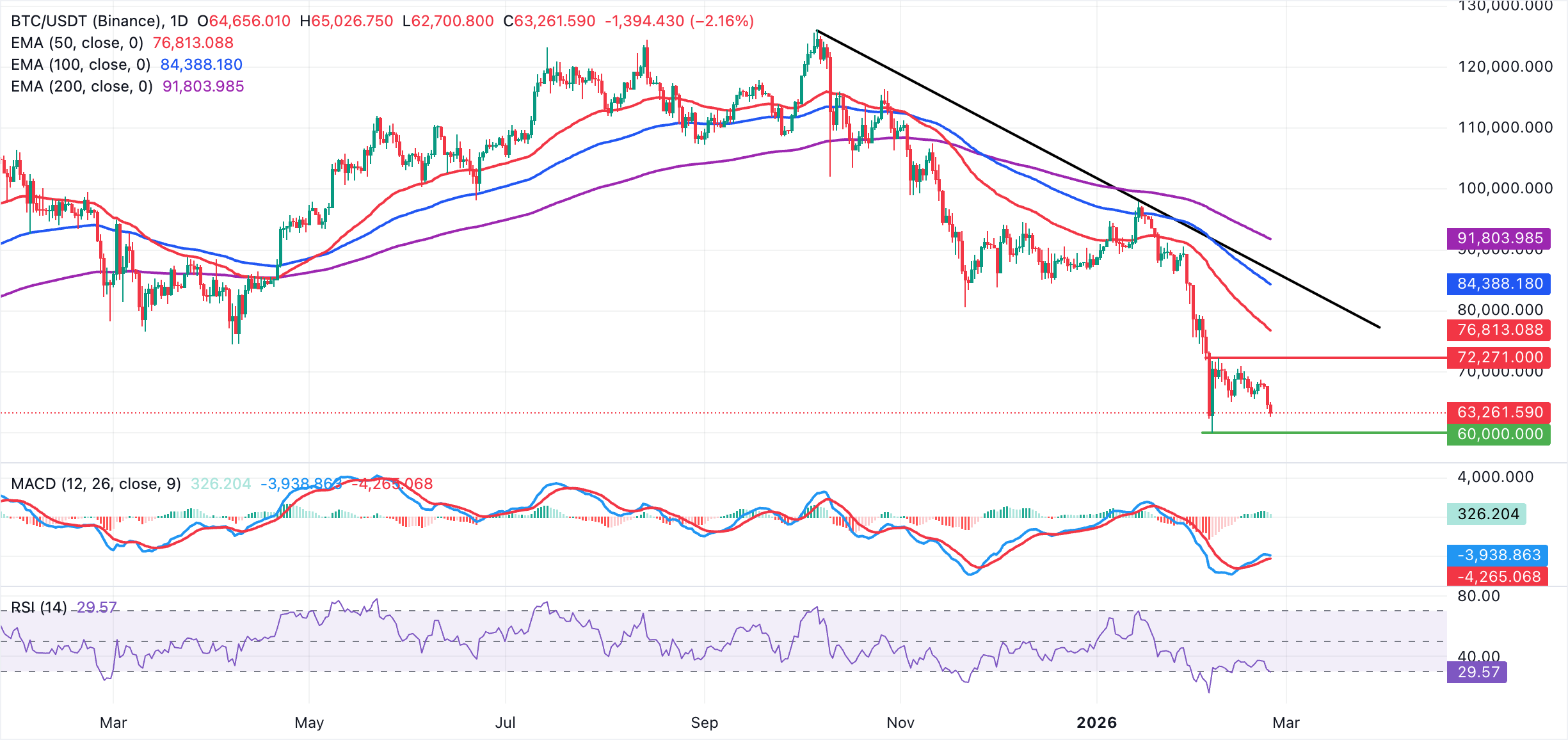 Bitcoin se cotiza a 63.261$, posicionado bien por debajo de la media móvil exponencial (EMA) de 50 días, la EMA de 100 días y la EMA de 200 días. Las tres medias móviles están inclinadas a la baja, confirmando una tendencia bajista dominante.