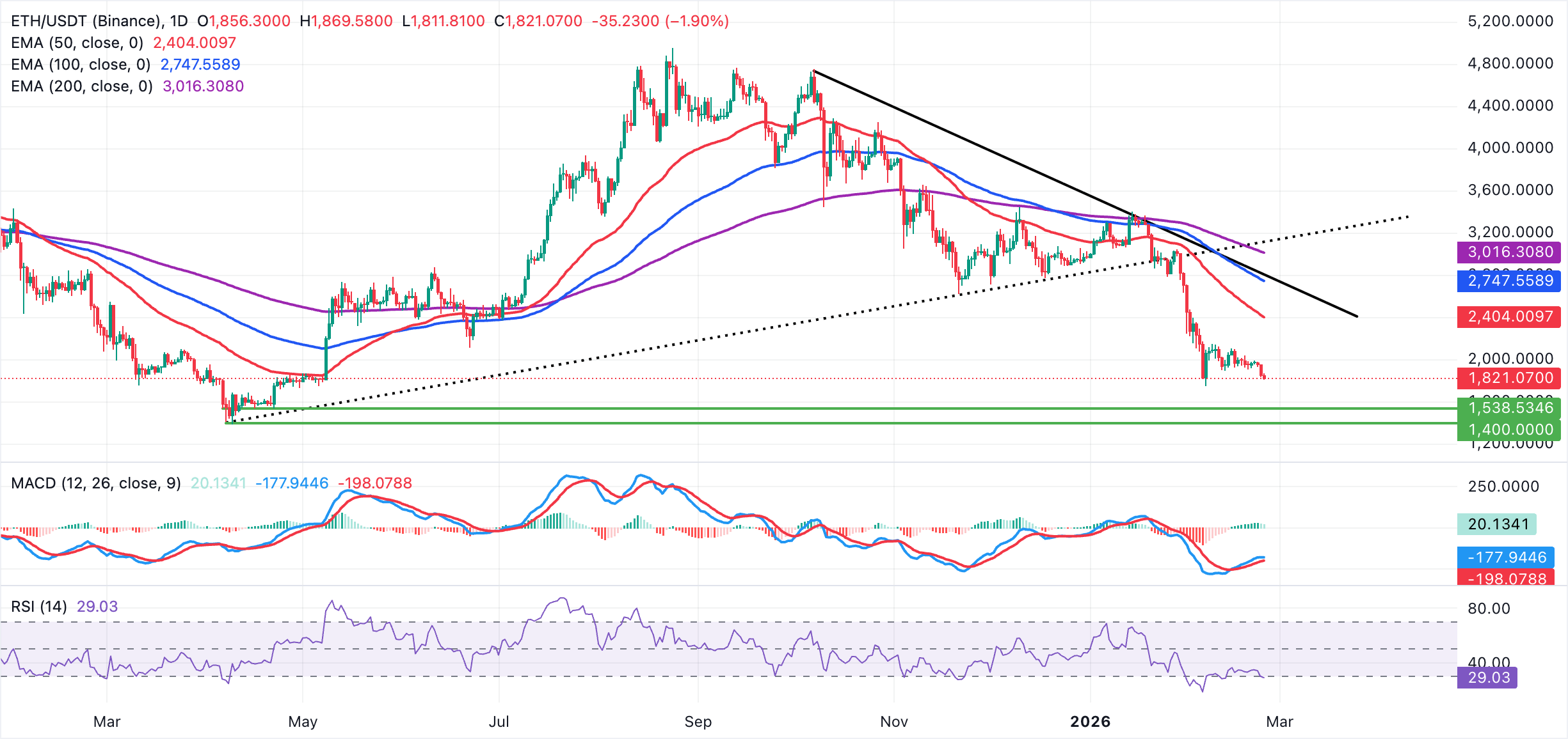Ethereum se está negociando en medio de un sesgo bajista general, ya que el precio se extiende hacia un mínimo intradía de 1.811$. Sus cierres diarios se sitúan bien por debajo de las EMAs de 50, 100 y 200 días agrupadas entre aproximadamente 2.400$ y 3.000$, subrayando una fase a la baja establecida. El impulso del token de contrato inteligente sigue siendo débil, con el RSI por debajo de 30 y la línea MACD por encima de su línea de señal pero aún por debajo de la línea cero, sugiriendo un trasfondo bajista con solo intentos de alivio modestos.