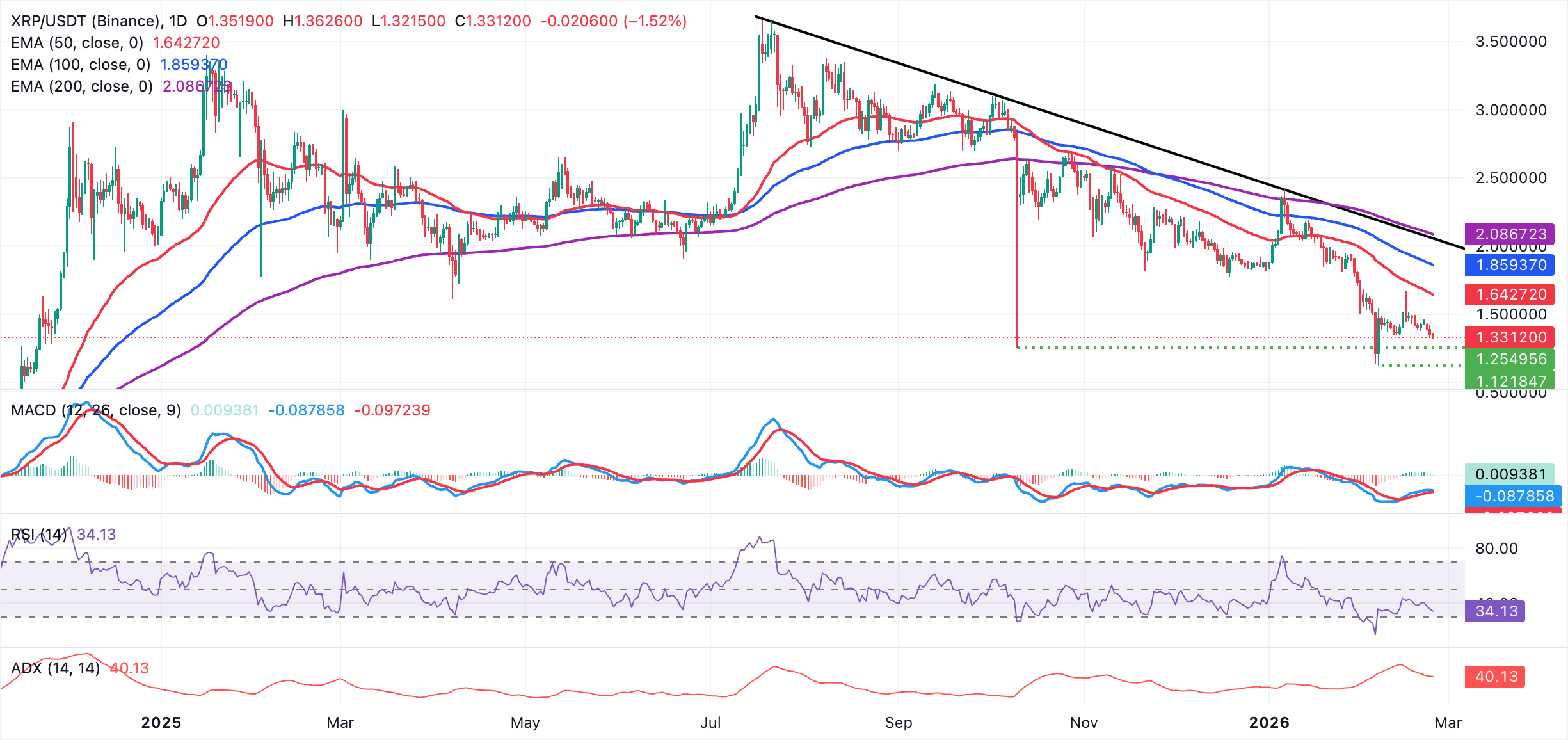 Mientras tanto, $XRP se mantiene en 1.33$ en medio de un sesgo bajista a corto plazo. El precio extiende su caída muy por debajo de la línea de tendencia de resistencia descendente, y ahora se negocia por debajo de las EMAs de 50, 100 y 200 días, que todas se sitúan por encima de 1.64$.