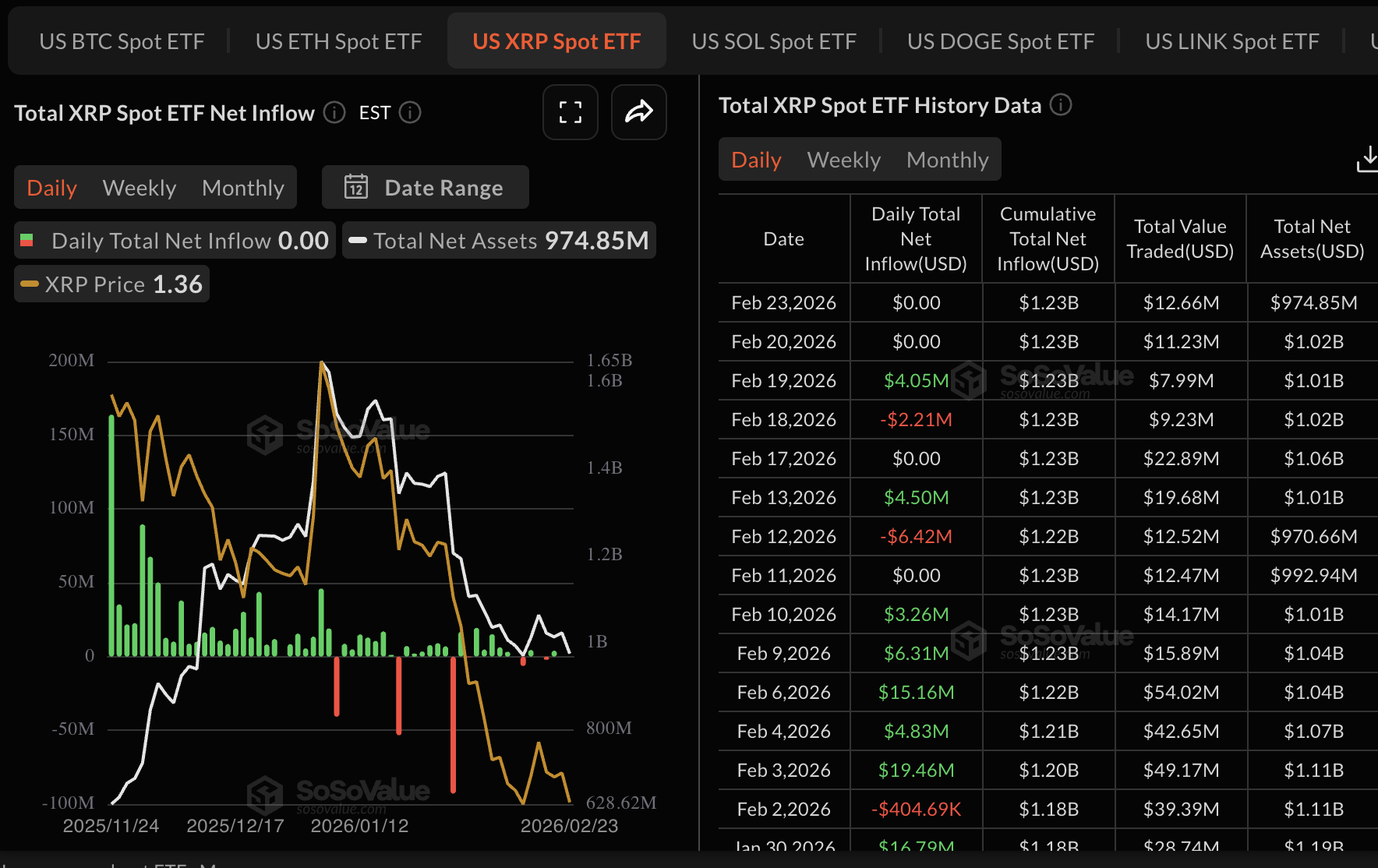 Los ETF de $XRP, por otro lado, permanecieron en silencio el lunes, marcando dos días consecutivos sin actividad desde el viernes. Las entradas acumuladas del token de remesas se mantienen estables en 1.23 mil millones de dólares, con activos netos bajo gestión de aproximadamente 975 millones de dólares.