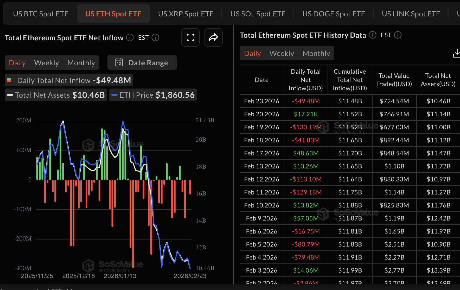 El interés en los ETF de Ethereum al contado listados en EE.UU. también está a la baja, con salidas el lunes que totalizan casi 50 millones de dólares. Las entradas acumuladas se sitúan actualmente en 14.48 mil millones de dólares, con activos netos bajo gestión de 10.46 mil millones de dólares.