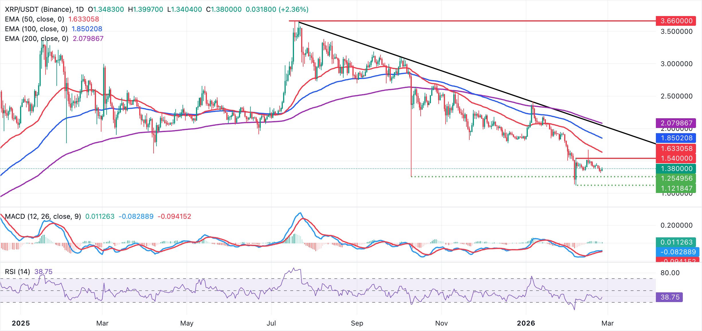$XRP se mantiene por encima de 1.38$ en medio de una corrección alcista en curso. A pesar de la leve recuperación desde la apertura diaria de 1.35$, el token se mantiene en una tendencia generalmente bajista por debajo de las medias móviles exponenciales (EMA) de 50, 100 y 200 días, que continúan inclinándose a la baja y limitando el potencial alcista.