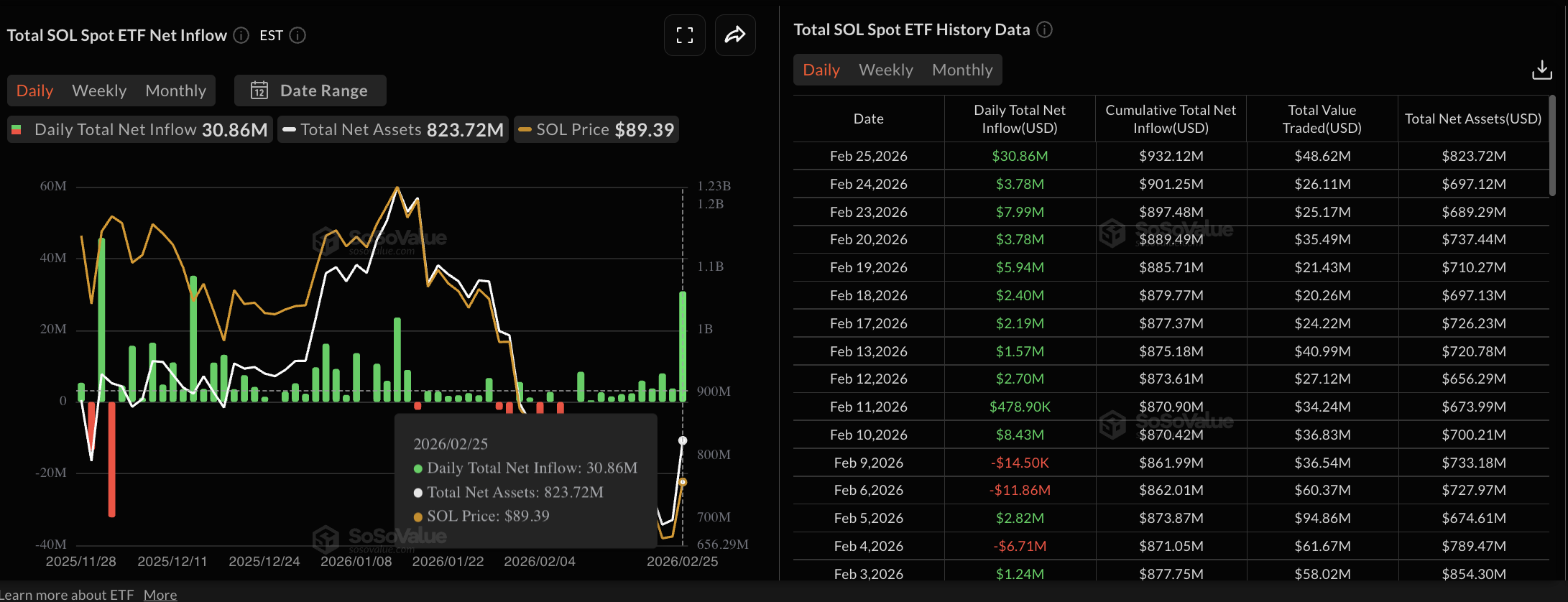 La demanda institucional por Solana se mantuvo estable durante el período difícil de las últimas tres semanas en medio de la volatilidad del mercado en general. Los ETFs de $SOL al contado registraron 30.86 millones de dólares de entrada neta diaria el miércoles, ampliando las tenencias durante el undécimo día consecutivo de entradas a un total de activos netos de 823.72 millones de dólares.