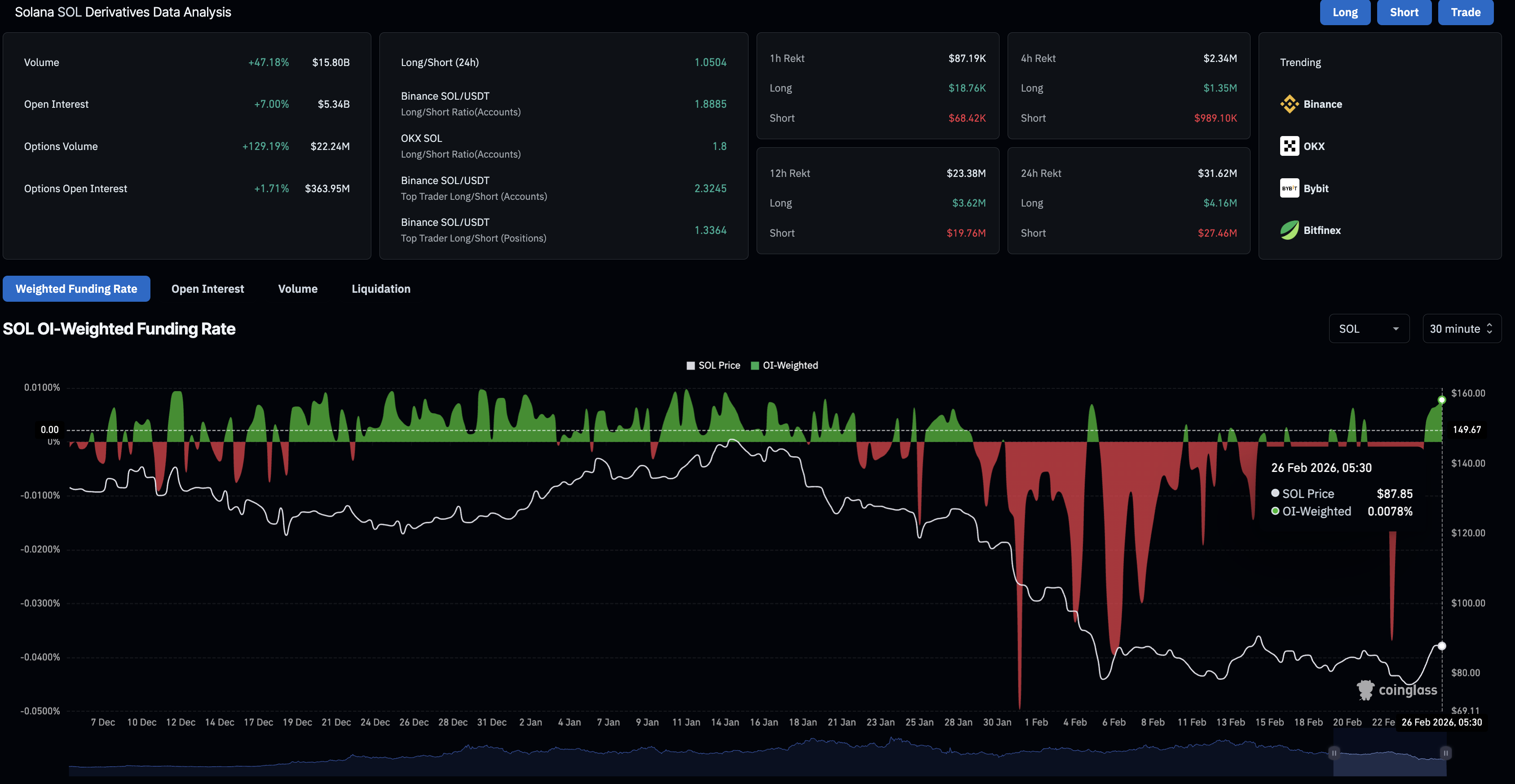 En el lado de los derivados, los datos de CoinGlass muestran que el Interés Abierto (OI) de futuros de $SOL es de 5.34 mil millones de dólares el jueves, un aumento del 7% en las últimas 24 horas, sugiriendo un incremento en el valor nocional de los contratos pendientes a medida que los operadores construyen más posiciones o aumentan el apalancamiento. Típicamente, un aumento en el OI refleja el interés de los operadores en un movimiento decisivo que podría ir en cualquier dirección.