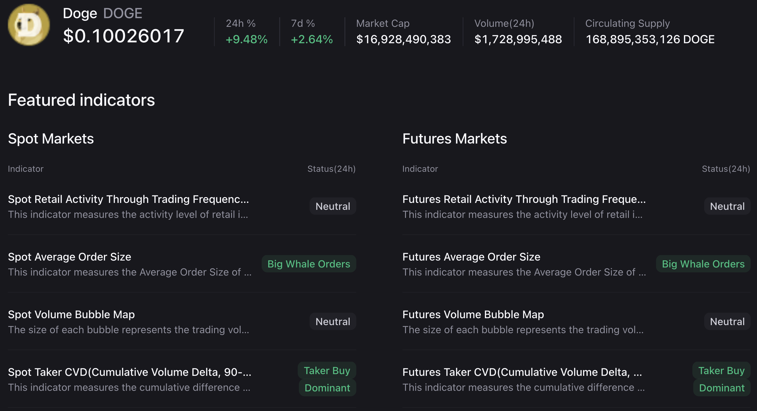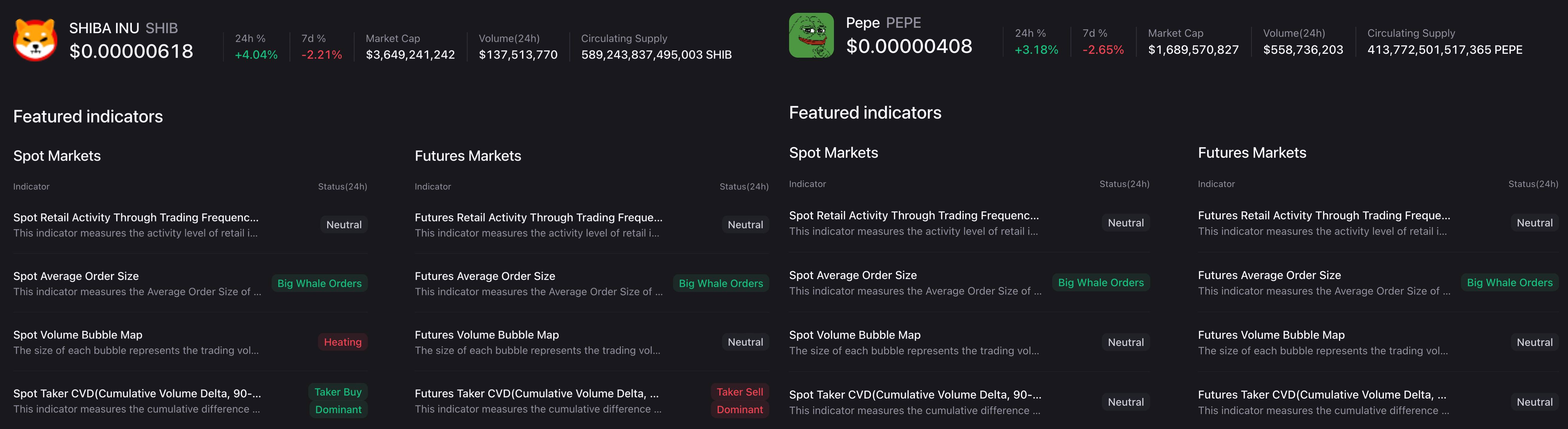 El CVD de futuros de tomadores sigue siendo dominante en ventas para Shiba Inu, mientras que se mantiene neutral para Pepe. Esto reafirma la preferencia de Dogecoin entre los traders de derivados.